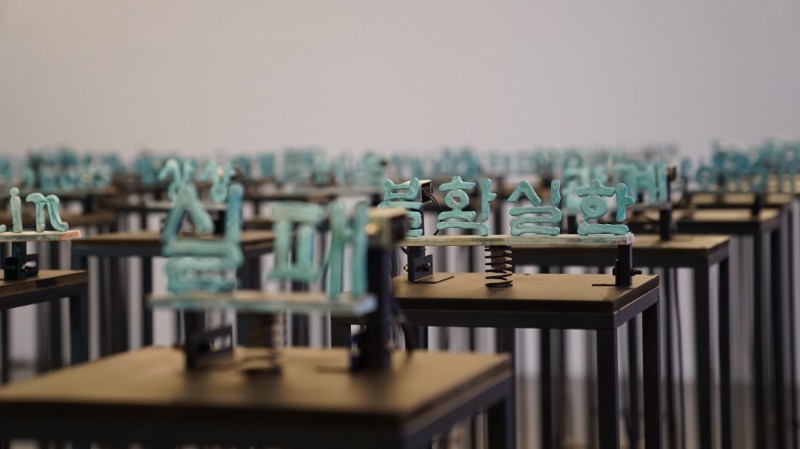 홍기원 개인전 《Appassionata variations 아파셔나타 변주곡》이 2019년 9월 7일부터 10월 6일까지 경기도 파주시 아트센터 화이트블럭에서 개최된다. 홍기원 작가가 2016년부터 진행 중인 ‘아파셔나타’ 연작은 시력과 청력을 잃어가던 베토벤이 테레사와 사랑에 빠지고 만든 소나타 No. 23. 〈Appassionata〉, 즉 소나타 〈열정〉에서 착안했다. 작가 또한 낙마사고로 인해 하반신마비를 겪고 지난한 회복 과정을 겪은 개인사가 있다. 개인사는 오브제의 기계적인 움직임, 공간, 신체, 기억을 주제로 유사 디즈니랜드를 구성했던 초기 설치 작업들에서 장애와 재활에 대한 기억과 연동되어 드러났다. 이후 작가는 오브제의 움직임 대신 환경에 반응하는 신체적 요소가 직접적으로 드러나는 퍼포먼스적 작업을 경유하여 2016년부터는 ‘아파셔나타’ 연작을 시도하고 있다. 이 과정은 오브제와 같은 외부 대상에서 출발하여 나와 내가 대상에 반응하는 환경의 우연성과 필연을 실험한 후 이제 우리의 환경을 구성하는 세계의 모순과 불가해함으로 나아간다. 이번 전시는 변주곡 연주의 자유분방함을 차용하여 기존 프로젝트의 마무리이자 새로운 프로젝트의 서두가 된다. 안장 공장, 말 전문 병원, 경마장 등 경마와 관련한 장소와 경마를 둘러싼 개인들의 증언과 기록, 경마로 상징되는 경쟁과 광기에 열광하고 욕망하는 사회가 던져온 나를 조종하는 것들에 대한 질문은 이제 현대 사회의 신화의 문제로 확장된다. 영상 작품에 포함되는 스페인 북부 사부세도(Sabucedo) 지역에서 행하는 야생마 축제와 스페인 북부 팜플로나(Panplona)의 성난 황소와 함께 달리는 산 페르민(San Fermin) 축제는 야생과 겨루는 인간의 무모함으로 한정해서 해석하기에는 충분치 않다. 축제와 인간사의 복합적인 양상에 대한 고찰은 작가가 포착한 사랑과 고통 모두를 의미하는 스페인 바스크 지방 고유 언어인 ‘마이테민두(Maitemindu)’의 의미와 중첩된다. 단순하게 설명 불가능한 삶의 표면과 이면, 축제로 전승되는 사회적 압력과 해방의 순간들, 다시 제자리로 돌아가는 질서와 이 질서를 구동시키는 기제들이 이 전시를 통해 변주의 형태로 등장한다. 전시에서는 키네틱 요소를 갖춘 신작 경마 출발게이트와 2018년 제작된 기존 작품으로 솔라로이드를 이용하여 일정한 간격으로 타종되는 주물글자 작품, 그리고 〈아파셔나타 #2 오필리아>, 〈아파셔나타 #3 마이테민두〉 와 〈아파셔나타 변주곡〉을 선보인다. 홍기원 작가는 영국 첼시컬리지 오브 아트 & 디자인을 졸업하고 개인전 《Appassionata #2, Ophelia》(스페이스캔, 서울, 한국, 2018), 《Appassionata #1, Mysterious Impression》(씨알 콜렉티브, 서울, 한국, 2017) 등과 기획전으로는 《생생화화 Hard-boiled & Toxic》(경기도 미술관, 안산, 한국, 2018), 《ZK/U 오픈스튜디오》(베를린, 독일, 2018), 《오픈스튜디오Bilbao Arte》(빌바오, 스페인, 2017), 《도시, 도시인》(북서울미술관, 서울, 한국, 2017), 《Acenite 2016 Proyecto'ace》(부에노스아이레스, 아르헨티나, 2016), 《경기유망작가 생생화화-신진: 열네 개의 시선》(고양 아람누리 미술관, 일산, 한국, 2016) 등에 참여했으며 P.S 베를린-ZK/U(2018), 빌바오 아르떼(2017), 에이스 피랄(2016), 테미예술창작센터(2015), 난지창작스튜디오(2013) 등의 레지던시에서 체류했다. 본 전시는 경기문화재단 <경기예술창작지원사업 시각예술분야 개인전부문>에 선정된 사업으로 경기문화재단, 경기도, 한국문화예술위원회, 아트센터 화이트블럭의 후원으로 열린다.