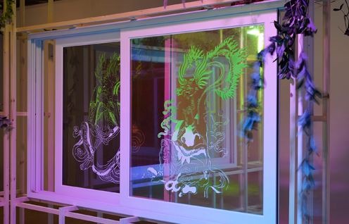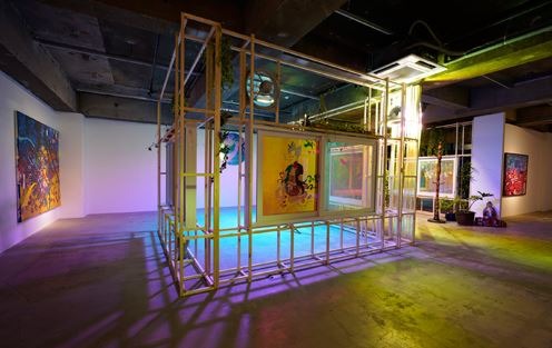공간을 가로지르며 놓인 유리창들에는 괴물 같은 형상이 그려져 있고 그 유리창에 내가 비친다. 금방이라도 굿판이 벌어질 것 같은 풍경이지만 자세히 보면 벽에 붙은 그림과 탱화는 색테이프로 만든(그린) 것이고, 선반 위에는 마른 화분이나 부탄가스통 등 마치 길에서 주워온 것 같은 물건들도 놓여있다. 김형관은 오랫동안 관심을 가지고 주제로 삼아온 굿이나 무속신앙 등의 초자연적인 샤머니즘을 그만의 예술적 실천으로 전환하는 작업을 선보여 왔다. 이러한 작업들에서 진일보하여, 이번 개인전 『감로 甘露』에서는 '감로탱화(Nectar Ritual Painting, 甘露幀畵)'에 등장하는 '아귀(餓鬼)'를 비롯한 여러 요소들의 상징성을 동시대가 그리는 디스토피아Dystopia/유토피아Utopia간의 긴장으로 전환한다.