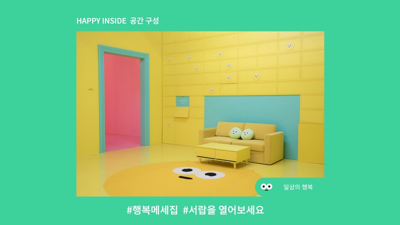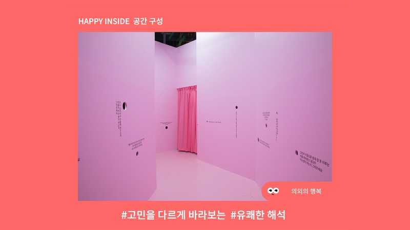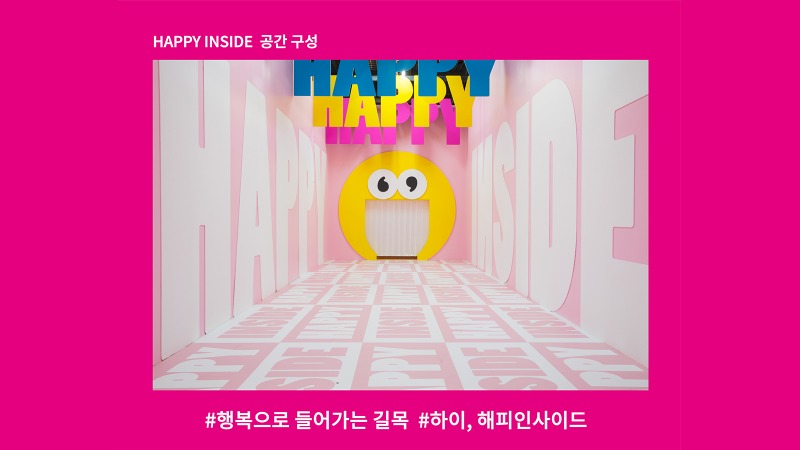 • 			해피인사이드는 일상 속 다양한 감정을 표현하는 이모티콘의 모습과 행복을 접목하여 5가지 테마로 풀어낸 전시이다. 행복한 상상으로 가득 찬 시각적 조형물로 연출된 공간에서 행복으로 향하는 다른 시선에 대한 경험을 선사하고자 한다.