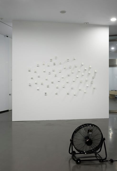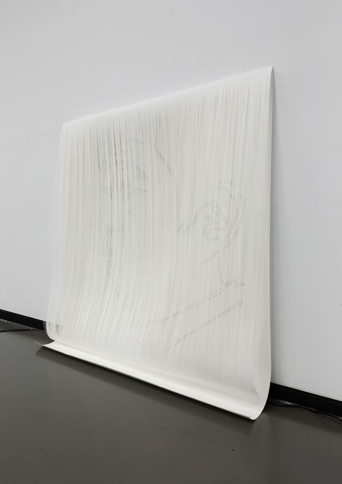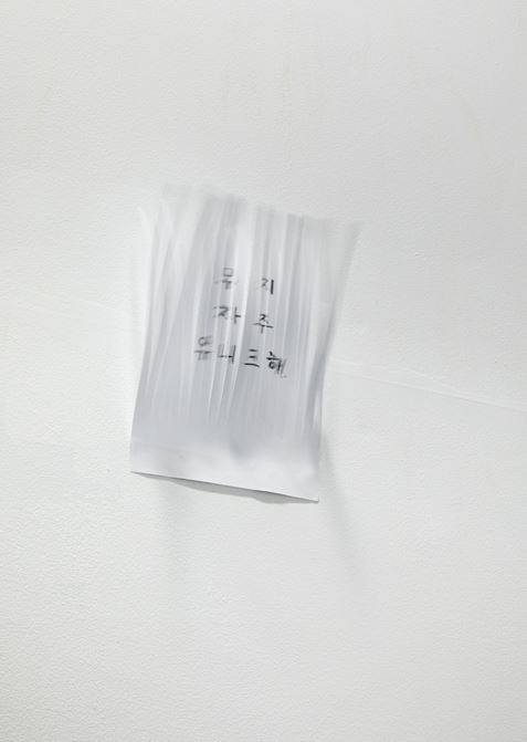 여러 대의 선풍기가 소음을 내며 시원한 바람을 일으킨다. 바람에 펄럭이는 종이조각들이 시선을 잡아끈다. 생경한 풍경에 이끌려 가까이 다가서면 간락한 필선의 드로잉 다발들이 겹겹이 춤을 추듯 움직인다. 한편에선 횡단 또는 종단으로 가늘게 잘려진 종이의 결들이 바람에 미세하게 흔들린다. 종이 위의 드로잉도 잔잔히 물결이 일렁이듯 움직인다.