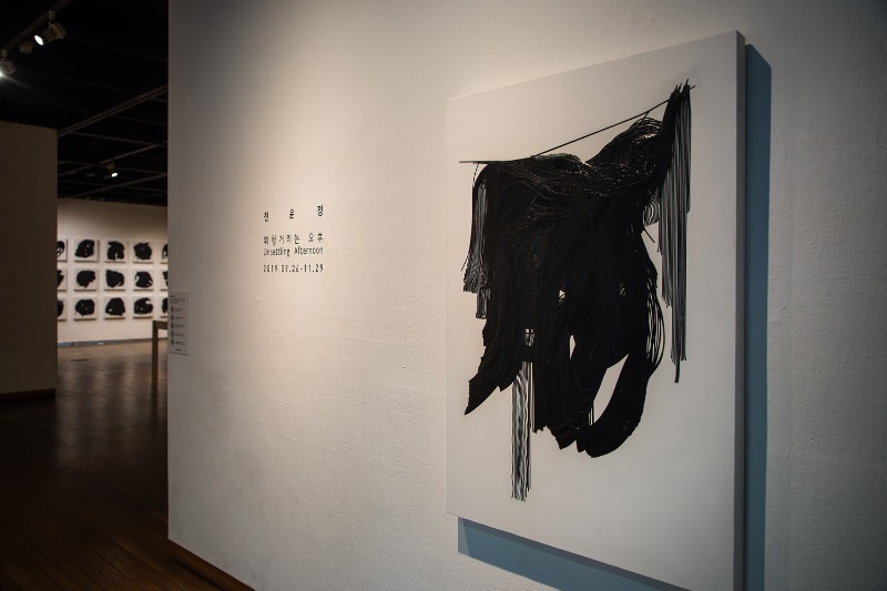 이번 전시의 제목인 《휘청거리는 오후 Unsettling Afternoon》는 1977년에 출간된 박완서 작가의 소설 제목을 차용한 것으로, 전윤정은 직간접적인 경험을 바탕으로 사회적 인간의 욕망과 허위를 비판하면서도 우리의 삶 속에서 마주하는 불편한 감정들을 담담하게 재해석한다. 그는 인간의 욕망을 탐구하고, 의식과 무의식 그 경계에 있는 표상을 시각화하기 위해 ‘라인 테이프’라는 이색적인 재료를 사용함으로써, 자신의 내면 안에 숨겨진 반항심과 억압된 자유를 ‘드로잉’으로 자신만의 해소법을 제안한다.