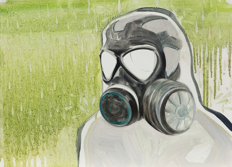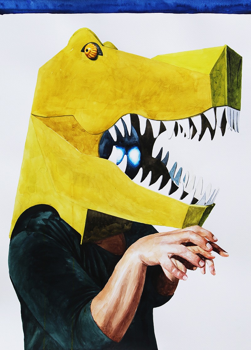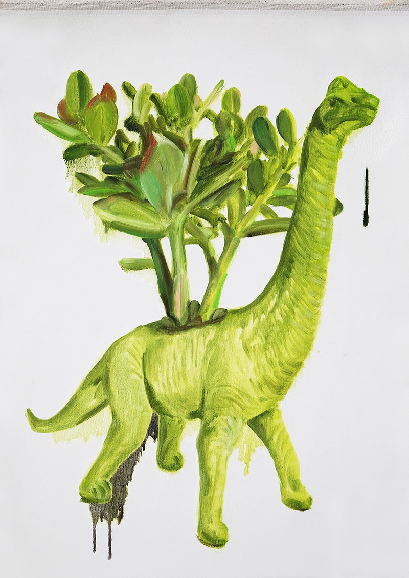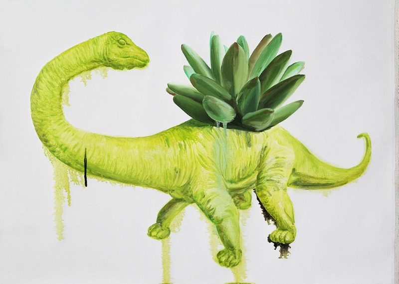 이번 전시의 대표작은 한 소년이 죽은 소의 젖을 짜고 있고 다른 한 소년은 우울한 표정의 소녀를 위로하고 있는 그림이다. 그림 속에는 날카로운 나무막대가 위를 향해 꽂혀 있는데 마치 샤먼의 세계에서 가장 중요한 세계수, 솟대를 떠올린다. 또는 무중력의 우주공간에 올린 우주선 같기도 하다. 실제 그림에는 장난감 같은 작은 비행접시가 그려져 있다. 다른 작품은 공룡의 가면을 쓴 인물이 반복해서 등장한다. 인과관계를 읽을 수 없는 별개의 사건과 이미지가 한 씬(시퀀스)으로 연출되어 있다. 작가의 작품 속 인물들은 얼굴을 가리고 등장한다. 결코 자신의 본 얼굴을 드러내지 않는다. 작가의 인물들은 영화 '조커'가 비극적 운명을 웃는 얼굴로 살아야 하는 인물의 영웅적 신화를 만든 것처럼 신화화된다. 사적인 작가의 세계에서 솟는 공허란, 인간의 비극적 운명, 냉혹한 시장논리, 질병과 전쟁, 착취와 폭력이 난무하는 현실에서 자란다. 영화보다 실제 현실이 더 지독하고 끈적하다.