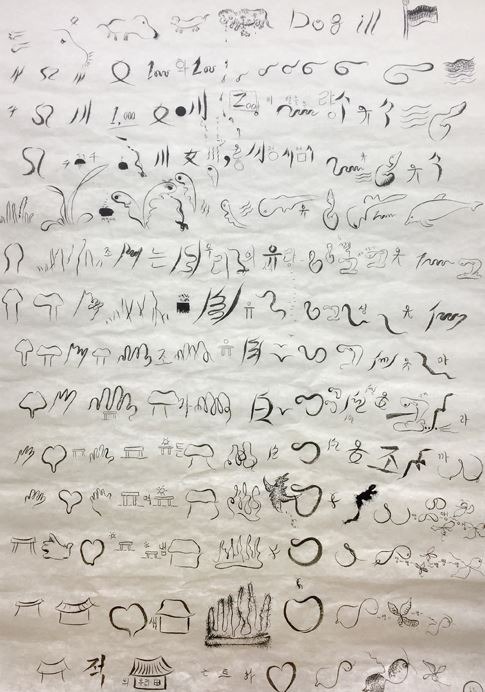 의식과 무의식을 오가며 만들어진 이미지, 물에 번져 변형·변질 된 이미지에 다시 작가의 의식을 개입시켜 새로운 형태로 재탄생 시킨 것이 드로잉 작품 「다리로부터 From the Bridge」이다. 이 드로잉 안에서도 개별 형태들에 비선형적 변형이 이루어지고 있는 모습을 볼 수 있다. 전시 공간을 가로지르며, 혹은 연결하며 2~3미터 길이로 길게 펼쳐진 문장은 드로잉을 문장 형태로 만든 텍스트이다. 이 텍스트는 이두(吏讀)**식 표기 방법으로 이루어져 이미지와 긴밀한 관계성이 있기 보다는 느슨하고 새로운 문맥으로 탄생된다. 이와 같은 회화-드로잉-기호의 연결은 작가의 이전 작업 'hypertext'에서 보여준 바와 같이 비연속적인 링크로 연결된 개별 정보의 종합으로 이해할 수 있다. 라멜라 구조를 이루는 고분자물질에 열 등을 가하여 가공하면 층상 구조가 모여 몇 가닥의 연결 분자 tie chain로 서로 연결되면서 더 안정적인 구(球) 형태를 구축한다. 유승호는 펜 드로잉에 고운 미스트를 뿌려 용해시킴으로써 기호-이미지를 화학작용처럼 반응시킨다. 이것을 바탕으로 연쇄반응처럼 만들어진 드로잉과 텍스트도 보이지 않는 몇 가닥 사슬로 연결되어있다고 상상해보자.