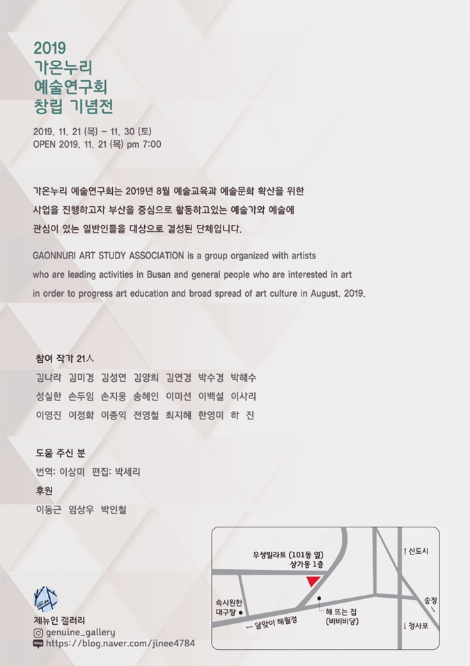 올해 해운대 달맞이길 제뉴인갤러리에서 창립 기념전을 시작으로, 매년 다양한 곳에서 작품 분야에 제한을 두지 않고 많은 작가들의 작품들을 전시하고 활동하면서 부산의 예술 문화를 확산시키고자 합니다,