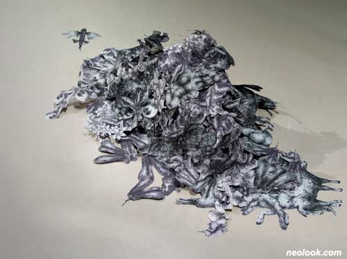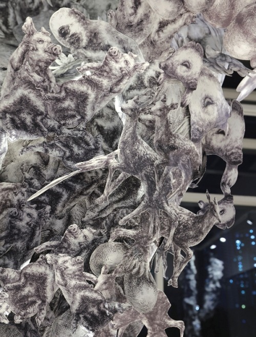 <전시소개> 봉산문화회관의 기획, 「유리상자-아트스타 2020」전시공모선정 작가展은 동시대 예술의 낯선 태도에 주목합니다. 올해 전시공모의 주제이기도 한 '헬로우! 1974'는 우리시대 예술가들의 실험정신과 열정에 대한 기억과 공감을 비롯하여 ‘도시’와 ‘공공성’을 주목하는 예술가의 태도 혹은 역할들을 지지하면서, 동시대 예술의 가치 있는 ‘스타성’을 지원하려는 의미입니다. 4면이 유리 벽면으로 구성되어 내부를 들여다보는 관람방식과 도심 속에 위치해있는 장소 특성으로 잘 알려진 아트스페이스「유리상자」는 어느 시간이나 전시를 관람할 수 있다는 장점 때문에 시민의 예술 향유 기회를 넓히는 데 기여하고, 열정적이고 창의적인 예술가들에게는 특별한 창작지원 공간으로 자리매김하고 있습니다. 앞으로도 공공예술지원센터로서 시민과 예술인의 자긍심을 고양시키는 역할을 수행하기 위하여 전국공모에 의해 선정된 참신하고 역량 있는 작가들의 작품 전시를 지속적으로 소개하고자 합니다. 올해 유리상자 전시공모 선정작 첫 번째 전시, 「유리상자-아트스타 2020」Ver.1展은 회화를 전공한 강주리(1982년생)의 설치작업 ‘살아남기 To Survive’입니다. 이 전시는 우리가 살고 있는 현실 세계의 생태적 변화들을 주목하고 그 양상을 수집하여 집적하는 행위의 흔적이며, 어쩌면 낯설고 괴기스러워서 살펴보지 않았던 생태 순환계의 변이와 진화의 실상들이 펜 드로잉의 방식으로 포획되고 겹쳐져 기이한 입체로 증식되는 상태에 관한 설계입니다. 작가는 자신이 설정한 ‘살아남기’라는 실체적 해석이 세계의 끊임없는 변화 상태와 어떻게 관계하는지, 또 이들 상황들이 우리의 감수성과 어떻게 만나고 어떻게 동시대 미술의 영역으로 합류하는지에 대하여 흥미로운 질문을 합니다. 강주리 작가는 4면이 유리벽으로 마감된 천장 높이 5.25m의 전시 공간 내부에 우주나 동굴에 있을법한 생태계를 조성하였습니다. 동굴의 천장에서 물이 떨어지며 자라는 종유석, 아니면 전자 현미경으로 확대한 먼지, 혹은 우주를 떠다니는 작은 유성체를 연상시키는 8개의 크고 작은 입체 덩어리로 이루어진 이 생태계는 수많은 ‘변이와 진화’의 대상과 상황들이 서로 관계를 맺으며 새로운 변화를 위해 한껏 움츠리고 있는 형상입니다. 이는 작가가 그동안 미디어를 접하며 주목해온 자연 생태의 변화와 그 흔적들의 수집과 증식, 또 증식한 개체간의 해체와 집합 등 진행 과정에서의 시간과 그 사태에 관한 시각적 서술이라고 할 수 있습니다. 작가가 오랜 시간동안 펜 드로잉의 짧고 가느다란 선들을 모으고 쌓아 구축한 70여개의 자연 변이와 진화의 실상은 이렇습니다. 눈이 하나뿐인 원숭이, 다리가 여섯 개인 강아지와 양, 다리가 여덟 개인 소, 다리가 다섯 개인 양과 개구리, 머리가 두 개이거나 꼬리가 붙은 거북이, 머리가 두 개인 개와 뱀, 고양이, 병아리, 도마뱀, 다리가 네 개인 오리, 콧구멍이 세 개인 젖소, 발가락이 기형인 이구아나, 머리가 두 개에 눈이 한 개인 돼지, 날개달린 고양이, 혀가 긴 개, 귀가 네 개인 고양이, 얼굴 두 개가 붙은 고양이, 등에 보호용 눈이 그려진 개구리, 알비노 코끼리, 해양오염으로 아가미가 변형된 물고기, 박스에 많은 양을 넣기 위해 만든 네모 오이, 입시 합격을 위한 네모 사과, 발렌타인데이를 위해 만든 하트 귤, 방사능 오염으로 씨 많은 과일과 뒤틀어진 채소들 등등, 이들 개체들은 우리의 삶과 현실 속에서 차이와 구별의 시선으로 발견한 자연 생태 변화의 징표들입니다. 작가는 이 손바닥 만 한 종이 펜 드로잉들을 수백 수천 개씩 복사하고 오리고 붙여서 집합 형태로 공간에 펼쳐놓았습니다. 이게 뭘까요? 예사롭지 않은 소수 대상들의 차이와 구별로 이루어진, 이제껏 본적 없었던 거대하고 기이하며 지속적인 꿈틀거림. 그렇습니다, 그동안 볼 수 없거나 보지 않거나 보지 못했던, ‘살아남기’를 위한 생명체의 변이와 진화가 종유석이나 먼지나 유성체처럼 쉽게 보기 어려운 ‘살아있음’의 상태로 설계된 것입니다. 이러한 작가의 설계 행위는 세상을 이해하고 소통하려는 ‘살아있음’의 자각과 시간을 들이며 수집하고 포획하는 노동 행위를 떠올리게 하며, ‘살아있음’의 창조를 꿈꾸며 응축하는 미술행위로 읽혀집니다. 한편으로, 유리상자 안에 설치된 변화의 흔적들은 ‘살아남기’ 위해 주변의 상황에 따라서 언제든지 변할 수 있는 상태의 상징이고, 우리의 의지와는 무관하게 진행되는 ‘자연’의 ‘살아남기’를 상징하며, 미술가로서 작가가 주목하는 것이 인간을 포함한 자연의 일부로서 세계의 ‘변화’ 자체임을 짐작하게 합니다. 작가에게 있어서 변화의 상태에 대한 관심은 인간 중심적인 자기 이해가 아니라, 우리들 현실의 삶을 숙고하고 그 대응 태도를 되돌아볼 수 있게 하려는, 그 속에 예견된 자연의 ‘실체’에 대한 경외심을 공감하여 드러내려는 것입니다. 어떤 변화의 현실을 보이지 않는 내면적 인식으로 번안하려는 이번 유리상자는 변화하는 자연을 주의 깊게 살피고, 그 속에서 예술의 유효성을 추출하려는 작가 스스로