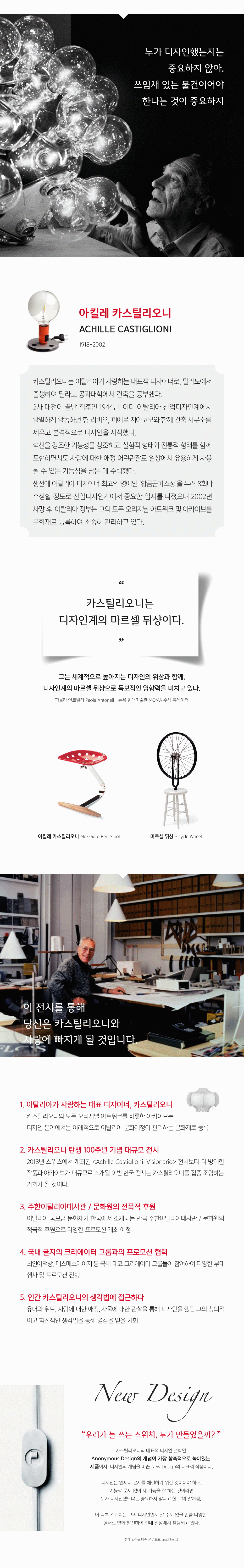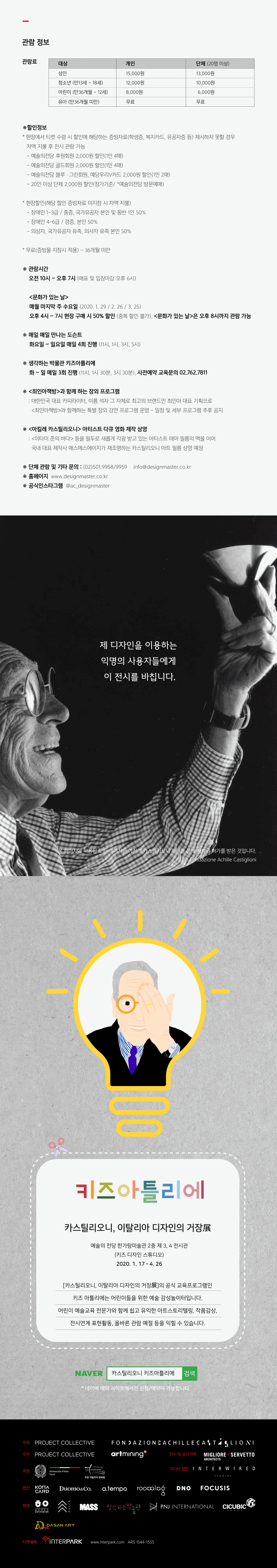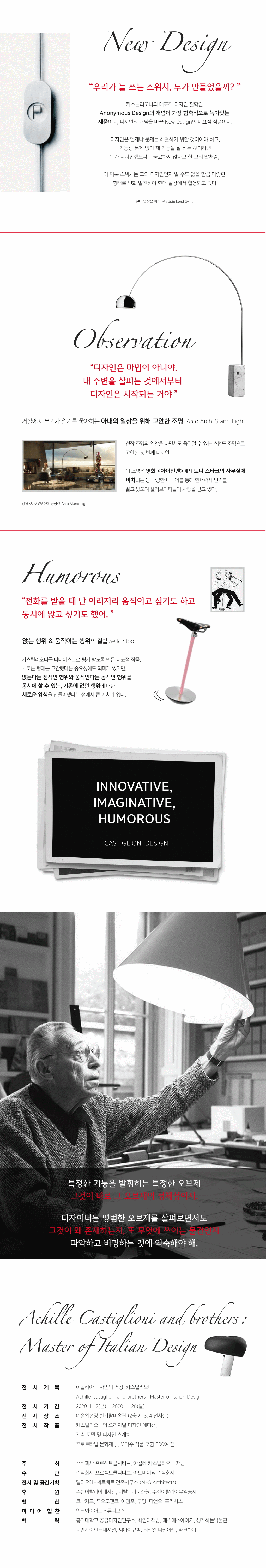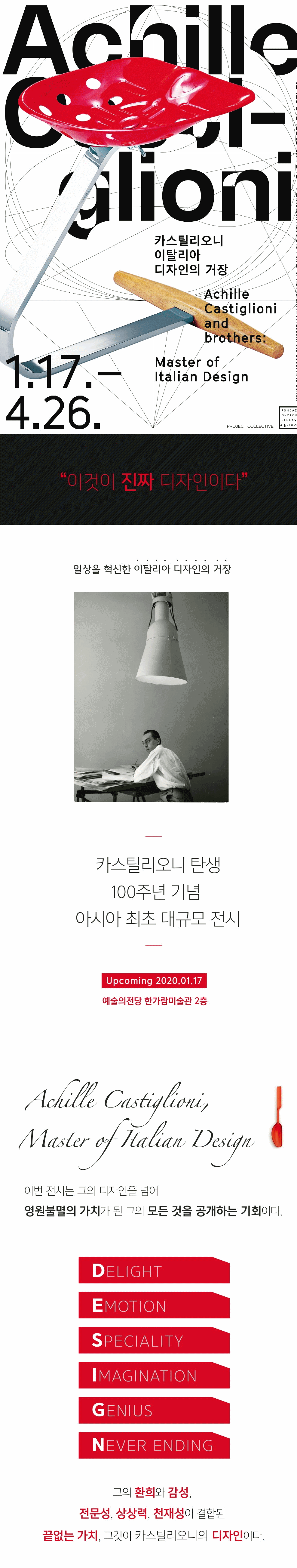 [전시소개] 프로젝트 콜렉티브와 아트마이닝이 공동 주관하고 주한이탈리아대사관과 이탈리아문화원의 적극적인 지원을 통해 준비되고 있는 이번 전시는 디자이너로서는 흔치 않게, 작품으로서의 중요성을 인정받아 이탈리아 문화재로 등록된 명실 상부 최고의 디자이너 아킬레 카스틸리오니의 탄생 100주년을 기념하여 아시아 최초로 한국에서 개최되는 초대형 특별전입니다. Zanotta, Alessi, Flos, Brionvega, Karakter 등 카스틸리오니와 함께 독특하고 혁신적인 제품들을 발표했던 인터내셔널 브랜드의 한국 독점 벤더 기업들이 협찬하고, 카스틸리오니의 제자이자 최고의 공간 기획자로 명성을 얻고 있는 이코 밀리오레와 마라 세르베토가 전시장 디자인에 참여해 보다 풍성하고 멋진 공간을 만들어냈습니다. 20세기 디자인 아이콘 100여점과 관련 아카이브가 함께 전시되며, 포토제닉하고 인터렉티브한 공간 속에서 유쾌하고 기발했던 카스틸리오니의 생각법을 몸소 체험할 수 있을 것입니다. [작가소개] Master of Italian Design - 20세기 디자인의 아이콘 이탈리아가 사랑하는 대표적 디자이너 아킬레 카스틸리오니 밀라노 공과대학에서 건축을 공부한 카스틸리오니는 2차 대전이 끝난 직후인 1944년, 이미 이탈리아 산업디자인계에서 활발하게 활동하던 형 리비오, 피에르 지아코모와 함께 건축 사무소를 세우고 본격적으로 디자인을 시작했습니다. 애정 어린 시선으로 일상을 관찰하고, 실험적인 아이디어로 기능성이 돋보이는 제품들을 선보였습니다. 평범해 보이지만 대단한 그의 제품들은 오랜 시간이 지난 현재까지도 디자인의 정석이라 불리며 많은 사랑을 받고 있습니다. 카스틸리오니는 이탈리아 디자이너 최고의 영예인 ‘황금콤파스상’을 무려 9회나 수상했으며, 이탈리아 정부는 2002년 카스틸리오니 사망과 함께 그의 모든 오리지널 아트워크와 아카이브를 문화재로 등록해 소중히 관리하고 있습니다.