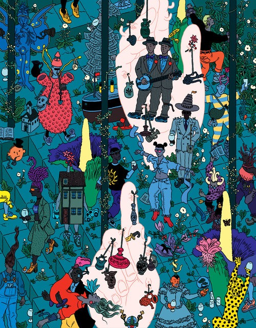 A. 나의 주된 영감은 네덜란드의 르네상스 회화, 20세기 중반의 코믹북(만화책), 20세기 초 신문 만화(newspaper comics)이다. 더불어 항상 새로운 예술과 디자인을 보고 영감을 얻고 있다. 최근에 나는 특히 19세기 후반의 프랑스 만화, 미국의 아웃사이더 예술, Ghanan flags에 관심이 많았다. 추가로 여행, 대화, 뉴욕 등 주변 환경에서 영감을 얻는다. 궁극적으로, 나는 세상이 어떤 모습을 하고 있는지를 설명하려 한다.