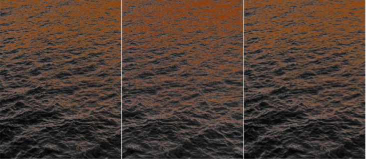 이 노래들은 시대와 세대의 경계를 넘어 불리고 또 불러진다. 사랑을 담은 가사들은 반복되어 불리는 횟수만큼 변질되고 오염된 언어가 되며 또다시 누군가의 ‘나만의’ 순수를 고백하는 수단으로 영원히 인용되는 반복의 속성을 보여준다 .전시의 또 다른 축인 이미지 작업은 텍스트 작업들 사이에서 조금은 다른 결의 모습을 보여준다. 텍스트 작업이 노래 가사에 녹아 있는 사랑의 맹신을 담고 있는 표현들에 초점을 두고 있다면 이미지 작업은 맹신의 이면 혹은 대척점에 주목하고 있다. 1층 전시장의 정면을 응시하고 있는 작업 <피에타>는 미켈란젤로의 3대 걸작으로 꼽히는 조각상 이미지를 차용한다. 십자가에서 죽음 당한 예수를 안고 있는 마리아의 모습에는 신과 인간, 아들과 어머니, 남성과 여성 등 복합적인 관계 사이에서 극복할 수 없는 사랑의 단절, 죽음과 애도의 현장이다. 120개의 조각으로 나누어 분절된 이미지로 재구성된 <피에타>는 작은 망점으로 또다시 파편화되어 있다. 이 작업에서 망점 기법은 분절되고 벌어진 틈을 보여주며 부식되어 파고들어 간 존재의 균열을 담아내는 역할을 동시에 수행하고 있다. 2층의 정면은 삼면화의 형식으로 걸린 <아마 우리는 다시 마주치더라도, 서로를 알아보지는 못할 것입니다1)>가 차지하고 있다. 이 작업의 바다 이미지는 3개 의 화면으로 나뉜 것이 아닌, 같은 바다의 조금씩 다른 세 가지 다른 모습이다. 자신의 사상이 바그너로부터 기인한다고까지 했던 니체가 바그너에게 절교의 의미로 보낸 편지의 내용에서 인용한 작품 제목은, 채울 수 없는 틈을 공유하는 필로스의 관계를 자발적으로 청산하려는 순간 쓰여진 니체의 이 문장으로, 스스로 사랑의 범주에서 벗어나려는 것이 얼마나 고통스러운 것인지를 느낄 수 있다. 우연히 마주치더라도 인지 불가의 상태가 되려는 니체의 비정함처럼, 무언가를 기억하기는 보다 무언가를 잊은 상태가 되어야 하는 분절된 바다는 어떤 이에게는 극복할 수 없는 거리에 대한 잔혹한 질문처럼 보인다.