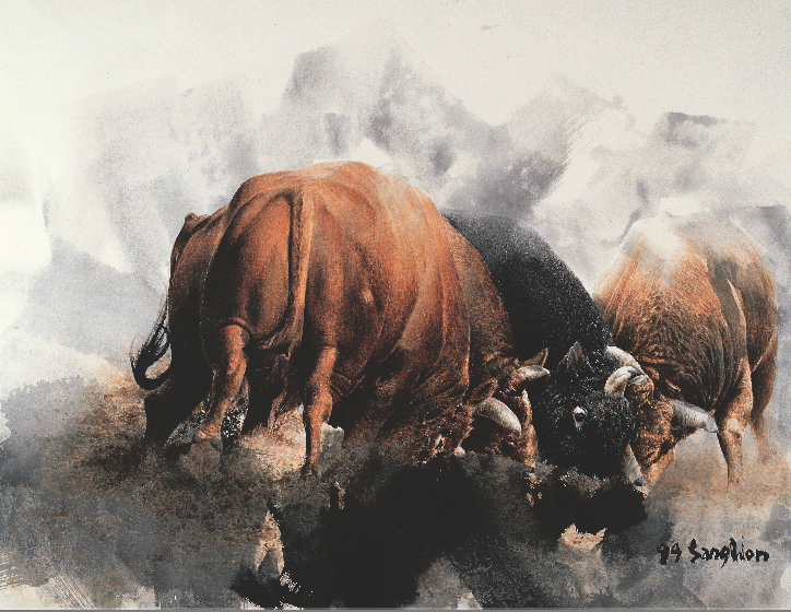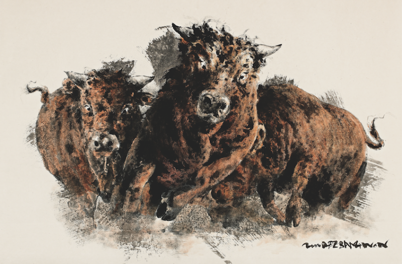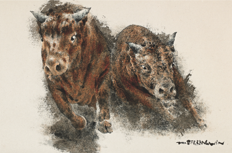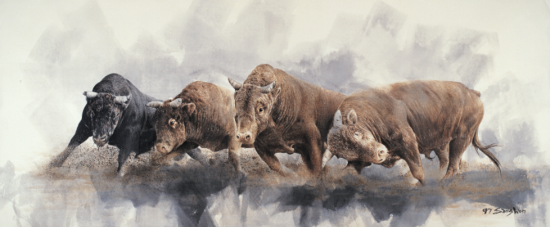 이상원미술관의 2020년 첫 번째 이상원 화백의 기획전은 <투 鬪 Fighting>이다. <투 鬪 Fighting>전시는 이상원 화백이 그린 ‘소 그림’으로 이루어져있다. 소는 여러 화가들-근현대 동서양화가들-이 다룬 소재이고 대중에게도 친숙하게 다가가는 소재이다. 이상원 화백은 20여 종류의 연작을 제작하였고 그 중에 ‘소 그림’ 연작이 있다. 소 그림은 여타 연작과 비교했을 때 상대적으로 적은 숫자로 제작되었다. 자연물 연작의 일환이라고 할 수 있는 소 그림은 ‘순무’, ‘호랑이’, ‘닭’ 등의 작품들과 같은 부류에 속한다. 그러나 ‘소 그림’은 기타 자연물 연작과 차별화되는 점이 있다. 자연물을 그린 그림 대부분은 이화백이 춘천으로 귀향한 2000년대 이후 제작되었는데 ‘투 鬪 Fighting’라는 제목의 소 그림은 귀향 이전(1990년대)의 버전과 귀향 이후의 버전(2000년대)으로 나눌 수 있다. 이번 전시에서는 두 가지 버전의 소 그림이 모두 전시된다. 작품은 200호 이상 대작을 포함한 17점이 소개된다. 이상원 화백은 소의 다양한 면모 중에 ‘싸우는 소’의 모습을 화폭에 담았다. 청도 지역에서 전통적으로 행해지는 소싸움 현장에 직접 참관하여 관찰하면서 작품을 구상하였다. 작품에 등장하는 소는 대결하는 모습이기보다는 무리지어 뒤엉켜있거나 질주하는 모습으로 그려졌다. 이화백이 표현한 소는 일반적으로 알려진 소의 이미지인 순박하고 어리숙한 대상이 아니다. 소에 대한 기존의 통념과는 다른 거칠게 싸우고 에너지를 폭발시키는 존재로 표현했다. 이를 위해 이화백은 소의 눈동자를 날카롭고 공격적인 느낌으로 표현하는가 하면 여러 마리의 소가 뒤엉켜 사투하고 있는 모습으로 그렸다. 이화백은 소의 눈동자를 어떻게 표현하는가에 따라 작품의 이미지가 크게 달라진다고 설명한다. 그의 소 그림은 다른 연작들에서 볼 수 있는 공통적인 특징인 도전적이고 집념에 가득 찬 열정을 드러낸다. 뒤엉켜 서로 몸을 부딪치며 싸우는 광경으로 묘사된 귀향 이전의 소작품은 사실적인 화풍으로 그려졌다. 일대일 대결을 벌이는 소싸움과 다르게 여러 마리의 소가 무리지어 있는 모습이다. 고향에 다시 정착한 이후 작업한 소 그림은 이전 작품에 비해 단순해진 묘사기법과 함께 귀염성이 있는 해학적인 면모도 드러난다. 서로 뒤엉키기보다 화면 밖으로 뛰쳐나올 듯이 질주하는 형태이다. 이처럼 다른 방식으로 그려진 두 시기의 소 그림 작품을 비교하며 감상하는 것도 전시를 보는 색다른 포인트가 될 것이다.