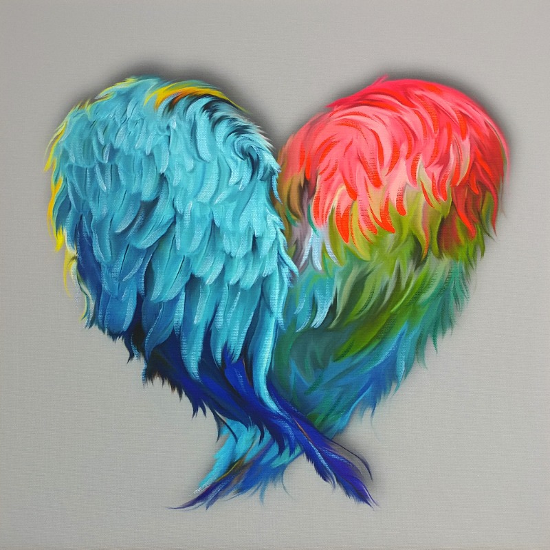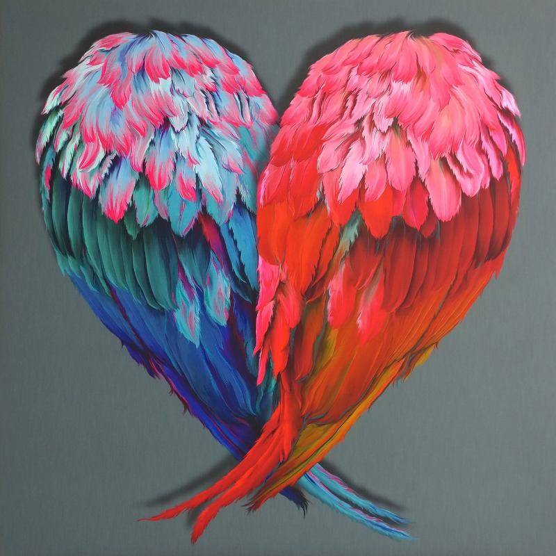 - 하트를 이루는 두 개의 날개는 각각 서로 다른 모습을 하고 있어요. 서로 다른 두 사람이 만나 행복을 만드는 모습을 그린 거예요.