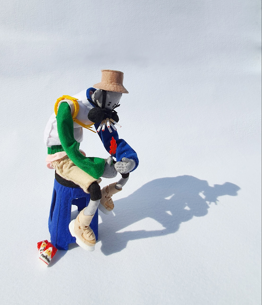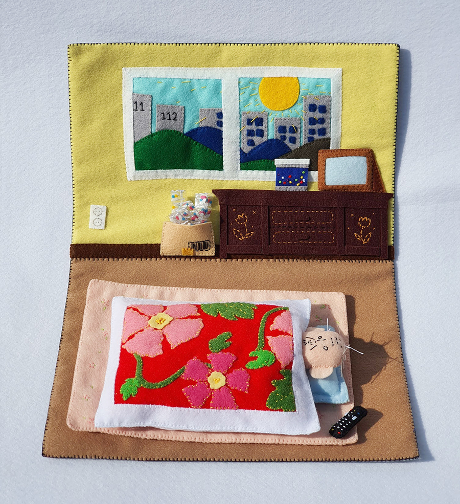 그들은 진짜 내 현실의 미세먼지 색감과는 반대로 알록달록함을 가득 품은 펠트라는 보드랍고 장난스러운 질감으로 표현되는데 이는 아기자기한 물감을 다루는 것 같은 느낌을 주곤 한다. 마치 알록달록한 물감으로 드로잉 하는 것처럼 가짜 현실의 인물들을 그려나가듯 손으로 자르고 만들어지는 누군가가 나의 현실에 만들어져 나오는 것이다. ​​​​