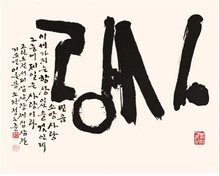 예술의전당 <정도준 전>은 추상미술과 전통서예를 일맥(一脈)으로 관통하는 정도준 작품의 필획Stroke과 구조Structure의 근원적인 천착을 통해, 우리 시대 서예의 새로운 진로를 함께 모색하는 것을 목표로 한다. 이번 전시는 최근의 <태초(太初)로부터>, <천지인(天地人)> 시리즈에서부터 기존의 한글 · 한자 각체혼융과 병존, 전각에 이르기까지 실험과 전통 대표작 70여점이 공개된다.