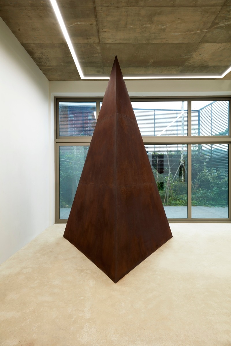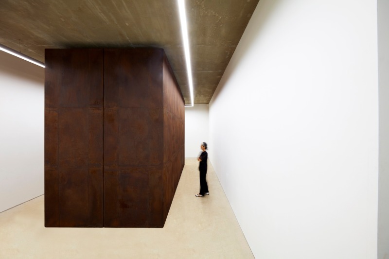 The exhibition hall is partitioned in two. One partition houses a trigonal pyramid that stands 360cm with a footprint dimension of 240cm on all sides. The other houses a rectangular sculpture with dimensions 240cm in depth, 480cm in width, and 360cm in height. The iron surface completely covers the spectator’s field of view with overwhelming scale. The size and form of the work reflects the physical conditions of the exhibition space. Transformation of the surface via casting and forging draws attention to the overall work, but minimal manipulation of the work draws attention to the external physicality and the actual space occupied by the work. In the small exhibition hall, the trigonal pyramid sculpture was planned while envisioning the view of the work through the outside window. Choi intentionally positioned the sculpture so the outside window view had the apex of the pyramid and its overall form obscured. In the large exhibition hall, the sculpture was planned with respect to the spacing of the ceiling lighting rail.