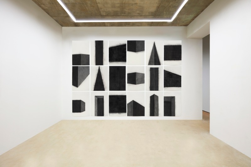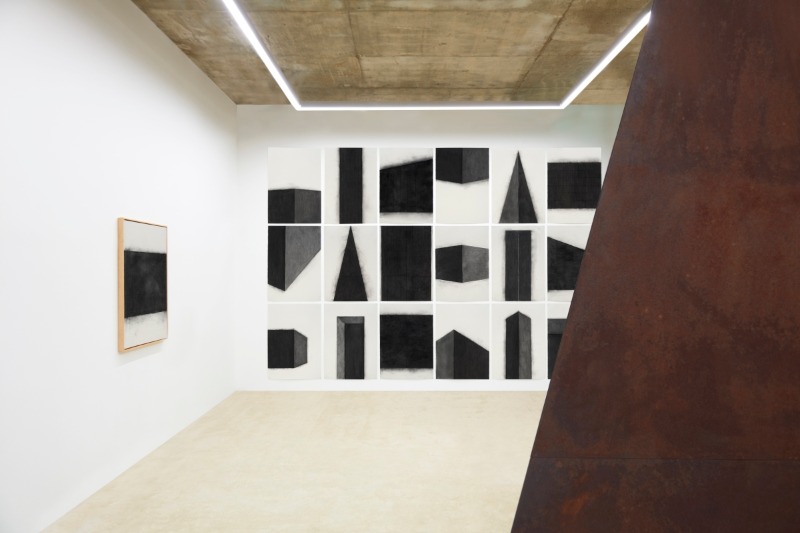 This exhibition will also feature Choi’s first drawn works. Before each ironwork, Choi draws and plans the process, as if it were a blueprint. The simple compositions and indifferently blank spaces of the drawings resemble his iron works, but the spilling of colors and the black-white contrast hint of physical properties not found in the iron works. Choi shares that he hopes for the drawings to be ‘unaffected byproducts’. He goes over the paper numerous times with charcoal, iterating and crushing the black unto the material, faithfully imparting the weight and density of iron unto paper. Once colored, the surface evokes the texture of iron; not as an additional layer, but as material transformation of a sheet of paper into a sheet of iron. The drawing could not be more sculptor.
