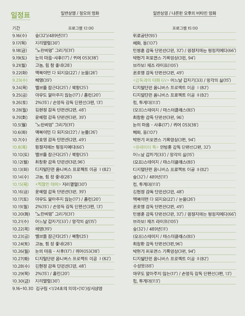 사전예약 필수 https://booking.naver.com/booking/12/bizes/406849/items/3576531 유성영화의 등장과 함께 다양한 규격으로 제작되던 영화는 24프레임으로 표준화되었고, 1/24초는 무빙 이미지를 가리키는 상징적인 단어가 되었다. 1초에 24장의 이미지 모음은 일련의 연속 화면을 만들어내며, 다양한 장르에서 발현된다. <Museum Cinema Festival – 1/24초와의 대화>에서는 한국의 미디어아트와 독립영화를 통하여 다양한 무빙이미지와의 대화를 시도한다. 전시는 한국의 근현대 미디어아트와 1980년대 이후 본격적으로 성장한 한국 독립영화 시장에서의 새로운 시도들을 조망하며, 이를 위해 영상작품을 소개하는 상영 프로그램과 아카이브 전시로 크게 두 파트로 나누어 구성하였다. ‘상영프로그램’에서는 현존하는 한국 최초의 실험영화인 김구림 <1/24초의 의미>와 한국의 1세대 비디오 아티스트 박현기의 <무제>, <도심지를 지나며> 등 퍼포먼스 기록 영상을 선보인다. 이와 함께 김범, 임흥순, 김소영, 권하윤, 정은영 작가 등 동시대적 영상작품들도 함께 소개된다. 독립영화 부분에서는 쉽게 접하기 힘든 대구지역 감독들의 단편영화들과 ‘한국영화아카데미’의 20주년 기념 디지털 옴니버스 <이공>의 작품들을 만나 볼 수 있다. 또한 봉준호, 권호영 등 감독들의 초기작들을 감상하며 창작자의 과거와 현재의 시각도 비교하며 관람할 수 있도록 하였다. ‘아카이브 전시’는 대구 독립영화 포스터를 필두로 <대구독립영화여지도>와 <독립영화/미디어아트_연대표>를 새롭게 제작하였다. 이를 통하여 지역의 독립영화뿐만 아니라 한국의 미디어아트와 독립영화의 발전과정을 함께 살펴볼 수 있을 것이다. 이번 전시에서는 상영작과 관련한 다양한 자료를 관련 기관과 감독들을 통하여 수집하였다. 시나리오와 콘티북, 필름과 카메라, 영사기 등의 실물 자료들은 작품이 준비되고 생산되는 과정의 이해도를 높이고, 영화가 만들어지는 과정을 엿볼 수 있게 한다. 이러한 제작 아카이브들은 자칫 창작의 부산물로 평가될 수도 있지만, 하나의 사료로서 개개의 가치를 부여받아 영상예술에 대한 이해를 돕는 역할을 하게 될 것이다. ‘미술관에서 영화보기’는 친숙하지만 친숙하지 않은, 이전과 조금은 다른 경험들을 선사하며 미술과 영화의 경계를 넘어 전시의 확장성을 실험하게 한다. 그리고 예술가들이 일구고 있는 실험적인 작품들이 빛을 잃지 않도록 지역사회에 소개하는 것과 동시에 관객들이 다양한 예술 장르의 벽을 허물고, 확장된 문화를 향유하는 기회가 되기를 기대한다. <일반상영> 월-토 / 총 5회 관람 (10:30, 12:00, 13:30, 15:00, 16:30) <부대행사> - 9.23(수) 15:00 감독과의 대화 GV (유지영, 고현석 감독) - 10.8(목) 15:00 큐레이터 톡 (영화로 만나는 미술) - 10.15(목) 12:00 직장인 데이 (경북대 및 인근 직장인 대상) ※ 모든 프로그램은 온라인 사전예약제로 운영됩니다. (53명) 김구림, 박현기, 백영수, 김범, 김남표, 임흥순, 권하윤, 정은영, 배용균, 유영식, 봉준호, 민병훈, 남무성, 권칠인, 권호영, 김소영, 김의석, 김태균, 김태용, 민규동, 박경희, 박기용, 오병철, 이수연, 이영재, 이용배, 이현승, 장현수, 정병각, 조민호, 허진호, 황규덕, 감정원, 고현석, 권진애, 김용삼, 김현정, 민용근, 박문칠, 박재현, 박지혜, 박찬우, 손영득, 신동일, 엄태화, 오성호, 유지영, 윤가은, 윤혜렴, 장병기, 정효정, 최창환, 황영 문의 : 경북대학교미술관 (053-950-7968/7978)