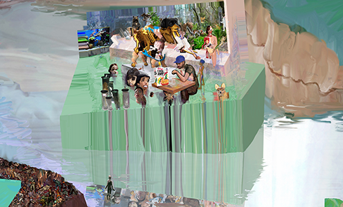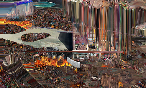 정해민 ‘Could not complete your request’ 회화의 종말, 종말 이후의 회화 정해민은 파괴와 폭력, 환란, 파국의 장면을 멀리 공중에서 비스듬히 내려다본 시점으로 그린다. 짙은 어둠을 배경으로 숱한 인간 군상이 격돌하거나 혼란스럽게 뒤엉켜 있는 모습이 어스름한 불빛이나 분출하는 화염 사이로 흘깃흘깃 보이는데, 다분히 묵시록적인 이러한 장면을 그리기 위해 정해민은 ‘포토샵(Photoshop)’ 프로그램을 사용한다. 때에 따라 미디어와 인터넷에 유통되는 기존의 이미지를 콜라주하여 조합하기도 하고, 포토샵의 페인팅 툴로 직접 그리기도 한다. 그리고 기존의 이미지나 작가가 포토샵으로 그린 이미지는 모두 작가의 묵시록적 비전을 구성하는 단위가 되어 그의 컴퓨터에 저장되었다가 전체 화면에 부분적으로 소환된다. 유쥬쥬 ‘마더랜드’ 삭제된 삶을 회복하는 몸짓 “인간의 삶은 얼마나 쉽게 삭제되는가.” - 주디스 버틀러, 『불확실한 삶』, p. 19 본래 성스러운(?) 교리를 갖가지 죄로 물든 이들에게 전파한다는 의미로 생겨난 단어, 프로파간다(propaganda/선전). 이 말은 제1차 세계대전이 시작되면서 수많은 사람들에게 전쟁의 명분을 심어놓기 위한 것으로 변질되었고, 다시 자본주의 아래서 수많은 이들에게 상품을 사들이도록 하는 기업의 교활한 도구로 전락하였다. 미국의 철학자인 주디스 버틀러의 말처럼, 우리는 어떠한 시대적 관점이 우리를 비난할 수 있다는 이유로 그리고 그 관점의 전염성에 포섭되지 않으면 배제될 수 있다는 강박으로 늘 두려워하고 우울해한다. 필자가 유쥬쥬의 작업 전반에서 포착한 키워드는 이렇듯 시대에 공헌하며 갖가지 모습으로 변신해온 ‘프로파간다’와 ‘관점들’이다.