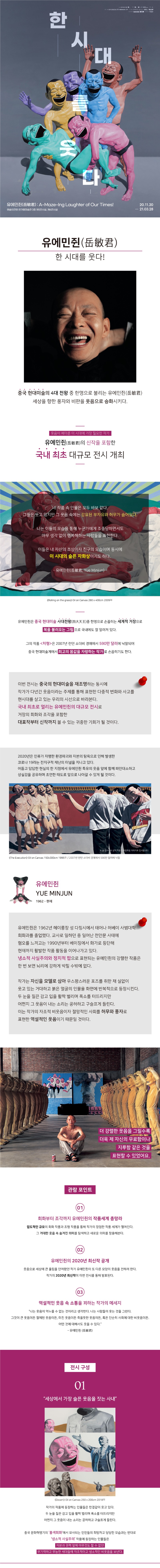 중국 현대미술을 대표하는 작가, 유에민쥔. 그의 국내 최초 대규모 개인전이다. 이번 전시는 그의 작품을 통해 중국 현대미술의 사대천왕이 된 그의 모든 것을 볼 수 있는 기회가 될 것이다.