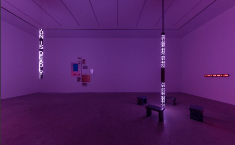 I like to compose the presentation of language. I like to make the language spatial. I like coming at it various ways to various ends. – Jenny Holzer Kukje Gallery is pleased to present a solo exhibition of work by Jenny Holzer. For more than forty years, language has been Holzer’s primary medium. Through incisive aphorisms and poetic texts, she engages with pressing social issues and injustices. The artist’s iconic phrases, as well as those she selects from other sources, confront and disarm viewers, creating public spaces that are both stark and emotional. Spanning the gallery’s K2 and K3 spaces, the exhibition brings together recent paintings and watercolors, stoneworks, and electronic signs, each deploying text of a distinct nature. Inviting viewers to read and contemplate political and personal texts through different sensory experiences, Holzer creates a platform of oscillation between the realms of feeling and knowledge, the individual and the collective. Holzer’s ongoing Redaction Paintings series bedecks the walls of K2. Using oil on linen, the artist translates government documents released by the Freedom of Information Act into paintings. Declassified but often heavily redacted, the US state and military papers are turned into giant abstractions, with the black blocks of redactions rendered in palladium, gold, and platinum leaf. One wall of K2 is transformed into a grid of Holzer’s newest watercolors, which are based on the US government’s “Report on the Investigation into Russian Interference in the 2016 Presidential Election,” known as the Mueller report. With bold titles ranging from dirt on HILLARY CLINTON to limit the amount of text to ultimate sin, this newest group of 36 watercolors looks back on an era of division and forward to the next chapter. Placed before the paintings are Holzer’s stoneworks, including various sizes of footstools and benches engraved with text. The tactile experience of tracing the letters cut in stone with one’s own hands provides an opportunity to reconsider the automated process of reading, opening doors to a conscious discernment and appreciation of emotion and comprehension. In K3, four LED signs—a medium Holzer has been using since the early 1980s—further manifest the artist’s exploration of text mediated by materials. She explains that “A great function of the signs is their capacity to move, which I love because it’s so much like the spoken word: you can emphasize; you can roll and pause, which is the kinetic equivalent to inflection in the voice.” Words roll up, down, and across the LEDs at varying speeds, blinking, blacking out, and sparkling in patterns. The visual rhythm of one sign is combined with rotating motions of an inverted turntable. Suspended from a robotic system installed in the ceiling of the gallery is TRUISMS (2020), a four-sided LED that is more than three meters long. In combination with the choreographed movement of the turntable, the words scrolling the LED become musical. This vertical LED displays a cycle of Truisms, a series of brief statements that the artist has humorously described as “Jenny Holzer’s Reader’s Digest version of Western and Eastern thought.” Variously stern, playful, aggressive, and sometimes contradictory, the Truisms appear here in both English and Korean. As one of the signs declares, CONFUSING YOURSELF IS A WAY TO STAY HONEST. Initially planned for the spring of 2020, this exhibition was postponed in the face of a global pandemic. The world has since witnessed and suffered from not only physical trauma but a dramatically accelerated degradation toward biased disunity. The year has been a tedious repetition of losing and regaining the self. At the end of a troubled year and looking toward a new start, we cautiously and proactively envision hope with the promise of a journey toward healing: IT’S CRUCIAL TO HAVE AN ACTIVE FANTASY LIFE. About the Artist For more than four decades, Jenny Holzer (b. 1950) has presented her astringent ideas, arguments, and sorrows in public places and international exhibitions, including the Venice Biennale, the Guggenheim Museums in New York and Bilbao, the Whitney Museum of American Art, and the Louvre Abu Dhabi. Holzer received the Leone d’Oro at the Venice Biennale in 1990, the World Economic Forum’s Crystal Award in 1996, and the U.S. State Department’s International Medal of Arts in 2017. She holds honorary degrees from Williams College, the Rhode Island School of Design, The New School, and Smith College. She lives and works in New York.