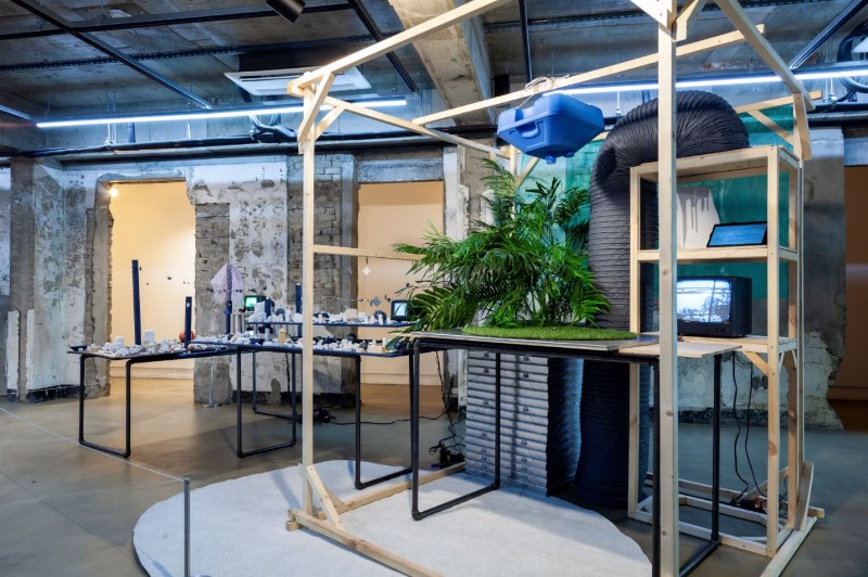 홍세진 작가의 작업은 참여 작가의 작업 중에서 가장 기술의 미래를 답보하면서도 지극히 개인적인 서사를 응축하고 있다. 출품작 <바늘의 끝>의 경우 다양한 사이즈와 질감의 ‘구’ 의 형태들을 전시하고 있는데, 이것은 작가가 오랜 기간 착용해 온 보청기의 메타포이기도 하다. 작가는 보청 기계의 진화과정과 더불어 기계의 센서와 감각에 대한 호기심과 나아가 인공지능 기술이 실현화 될 미래에 대한 예술가의 해석을 설치 시각 예술품으로 늘어놓는다. 이 작업은 아주 큰 구의 형태부터 테이블에 오밀조밀 배치된 작은 구들의 다양한 형태와 재질을 바라보는 재미가 있는 작업이다.