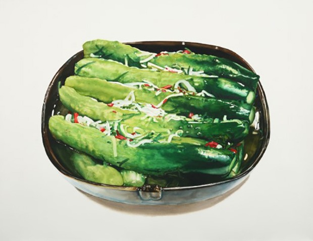 하영희 작가는 우리나라 식탁에서 빠질 수 없는 김치를 소재로 그림을 그립니다. 수많은 모양과 색이 있는 김치는 빨간 양념의 색과 강한 향으로 시각과 후각을 동시에 자극합니다. 작가는 이러한 김치의 특성을 살리기 위해 수채물감을 이용하여 물기 가득한 양념을 표현하고, 딱딱하고 반질반질한 그릇의 질감은 유화로 표현하면서 서로 다른 결을 나타냅니다. 항상 함께하지만 긴 시간 동안 들여다 본 적 없던 우리의 김치를 새로운 공간에서 마주해 보시기 바랍니다.