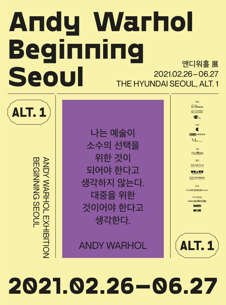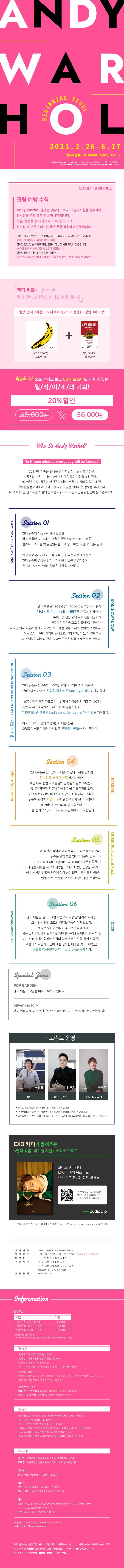 앤디 워홀 | 1928.08.06 - 1987.02.22 “모든 것은 스스로를 반복한다. 모든 것은 반복일 뿐인데, 사람들이 새로운 것이라고 생각하는 것이 놀랍다.” - 앤디 워홀 이탈리아 주요 도시의 대형미술관에서 성황리에 순회전을 마치고 한국에서 개최되는 대규모 회고전 앤디 워홀의 예술세계 전반을 아우르는 동시에 21세기 대중의 일상을 테마로, 시대를 앞서간 작가의 작품을 새로운 시선으로 돌아보는 계기를 마련하고자 한다. 앱솔루트 보드카, 캠벨 수프, 브릴로 박스, 마릴린 먼로. 이것들은 세상에 단 한 점만 존재하는 명화가 아니다. 앤디 워홀은 일상에 흔하게 널린 것들을 자신만의 ‘팩토리’ 에서 대량으로 찍어내며 예술의 대량 생산을 가동했다. 스스로를 ‘세상의 거울’이라 칭하며 거울에 비친 세상을 찍어내는 기계가 되고자 한 것이다. 그는 작품 세계의 확장을 위해 부단히 노력하였고, 끝내 미술의 전통적인 가치와 ‘작품의 희소성’이라는 개념을 전복시켰다. ‘어떠한 것’ 도 예술로 만들 수 있는 기회의 장을 제공한 것이다. 워홀은 우리에게 진정으로 중요한 본질이 무엇인가에 대한 질문을 던진다.