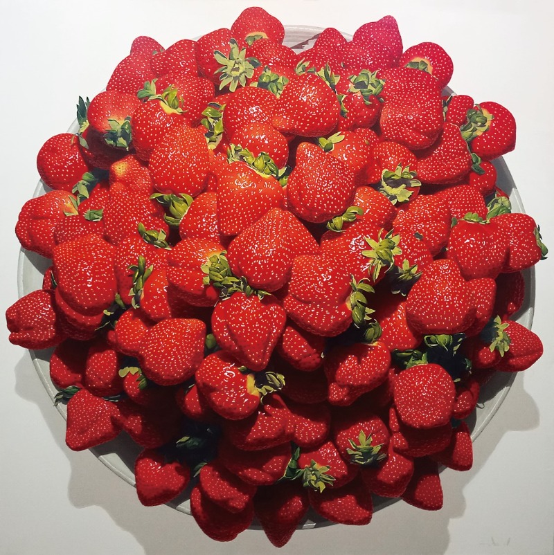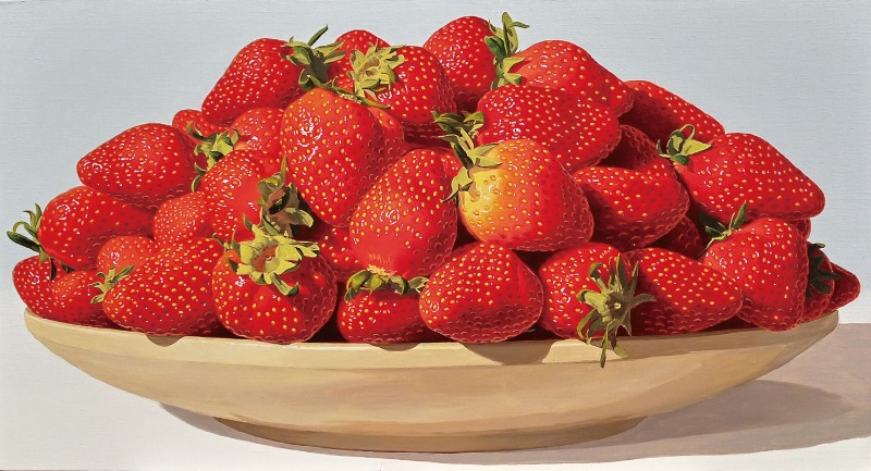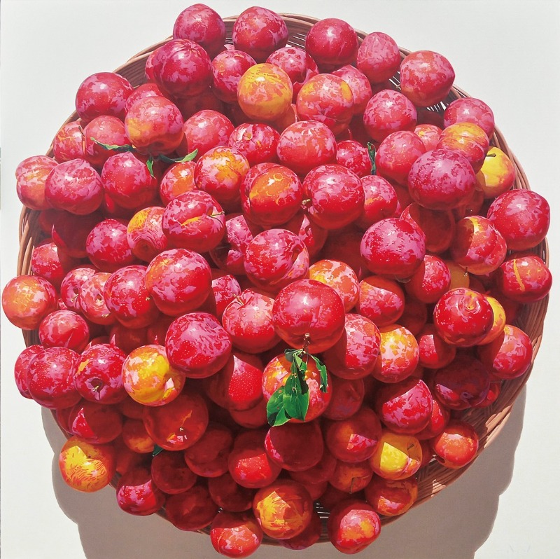 작가는 놀라운 섬세함과 꼼꼼함으로 딸기와 자두를 생생하게 그려냅니다. 마치 사진처럼 보이기도 하고, 손 안에 움켜쥘 수 있을 것 같은 착각을 불러일으키는 모습은 사실을 뛰어 넘어 감각적으로 다가옵니다. 평면 캔버스 위에 유화로 그려내었지만 명암과 그림자까지 치밀하게 표현되어 마치 입체적인 조각처럼 느껴지기도 합니다. 빨갛고 먹음직스러운 딸기와 자두는 금방이라도 튀어나올 것 같은 긴장을 유발하며 관람객의 탄성을 불러일으킵니다.