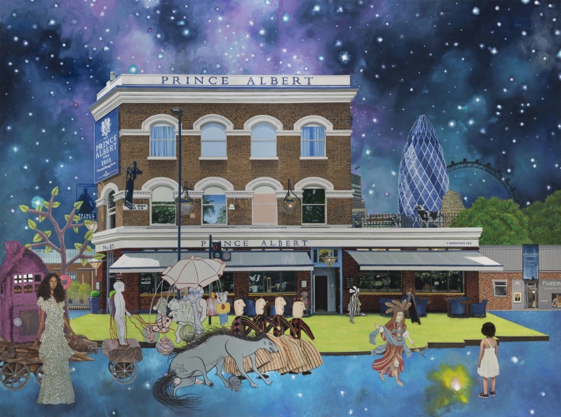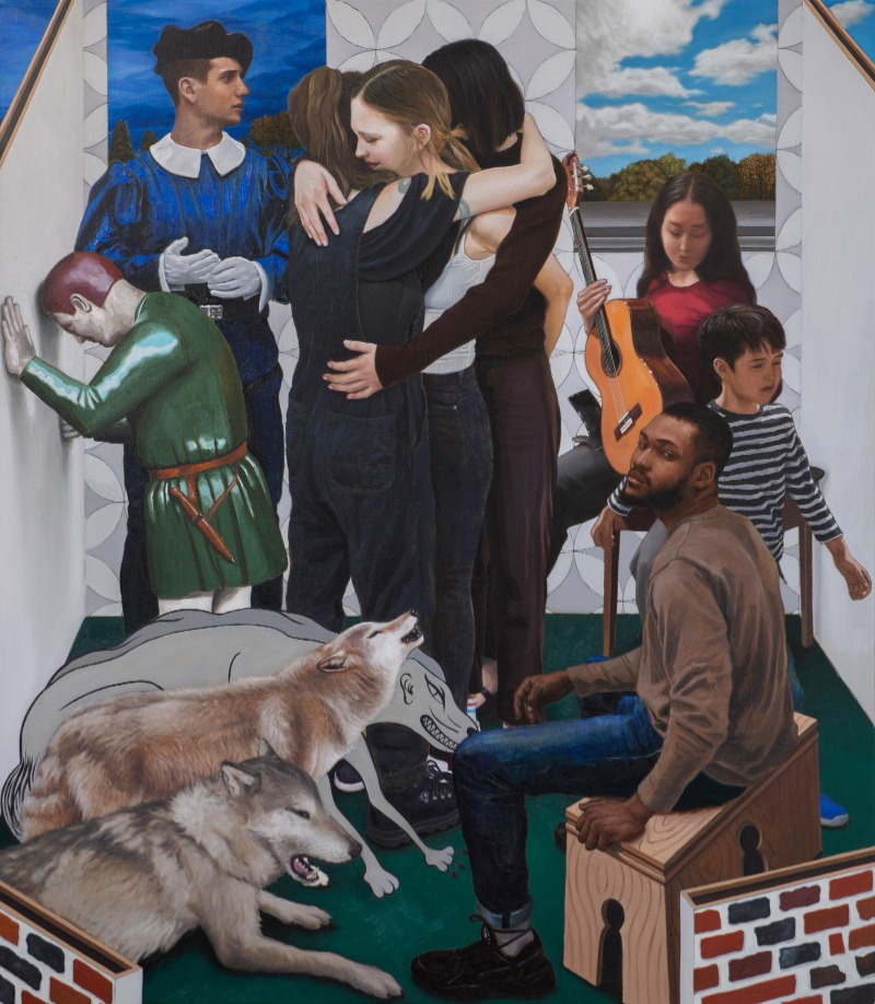 갤러리LVS(신사동)는 2021년 5월 6일부터 6월 5일까지 김성국 개인전 <The Storyteller>를 선보인다. 김성국은 서울대 서양화과를 최우등으로 졸업하고, 동대학원 졸업 후 영국왕립예술학교 서양화과 석사 학위를 받았다. 작가는 명화의 차용을 통해 관람자로 하여금 기존에 확립된 개념으로부터 벗어나 새로움과 호기심을 느끼게 하는 이른바 ‘생소화 효과’를 메시지 전달의 주 매개로 삼는다. 서양 명화 속 신화의 장면부터 작가의 기억 속 장면에까지 이르는 다양한 이야기를 시각화하여 재창조함으로써 익숙함과 낯선 느낌이 유기적으로 공존하며 일상적 이미지의 해체, 그리고 캔버스 안에서 새롭게 창작되어 생명력을 가지는 단편의 이야기들은 관람자로부터 다시 의미의 확장을 반복하여 또 다른 새로운 이야기를 계속해서 이어나간다. 글 · 갤러리LVS 이유진 이야기의 발견: 김성국 개인전 《The Storyteller》 글 · 박경린 시간을 거슬러 여행을 시작한다. 어두움이 내려앉은 어느 고풍스러운 유럽의 성을 떠올려 본다. 차가운 화강암으로 된 성벽에 등불이 일렁인다. 어디에선가 나지막한 노랫소리가 들린다. 텅 빈 곳을 채우며 울리는 소리를 따라가 두꺼운 나무문을 열어본다. 삼삼오오 모여든 사람들 사이로 아주 먼 옛날부터 사람에게서 사람으로 내려온 전설과 영웅의 모험담, 이루지 못한 사랑에 대한 슬픈 이야기들을 노래로 전하는 음유시인이 작은 하프를 켜며 이야기를 전한다. 나지막이 들려오는 소리에 따라 잠시 눈을 감는다. 얼마만큼의 시간이 지났을까? 어딘가 낯선 기운에 감고 있었던 눈을 뜬다. 환한 빛이 쏟아져 들어와 순간 멍해진다. 과거에 머물렀던 시간이 다시 현재로 돌아온다. 어느새 빛에 익숙해진 눈을 들어 벽을 바라보니 색으로 가득한 커다란 캔버스가 놓여있다. 그림 속 이야기를 따라 들어가 본다. 주인공으로 짐작되는 인물을 시작으로 배경을 살펴본다. 영국과 한국, 과거와 현재, 허구와 현실이 뒤섞인 이야기들이 관람객을 끌어당긴다. 가장 먼저 눈에 들어오는 것은 〈Stardust〉(2021) 이다. 황홀한 매력 또는 마력이라는 뜻과 소성단이라는 뜻을 가진 이 작품은 영국에 거주하던 당시 작가의 추억이 깃든 장소로 안내한다. 영국 왕립학교에 재학하던 시절 친구의 추억이 깃든 장소를 그림의 무대로 삼았다. 이곳에서 슬픔과 기쁨, 혹은 지리한 일상을 나누었다. 당시 그곳에서 느꼈던 모든 희로애락도 시간 속에서 추억으로 흘러갔다. 〈Stardust〉의 무대가 되는 곳은 가장 현실적인, 가장 영국적인 동네에 위치한 작은 펍, 관광객들이 꼭 들르는 경로 중 하나인 런던시청과 런던 아이를 배경으로 한다. 그러나 무대 속 인물들은 평범하지 않다. 중세 시대 그림 속에서 튀어나왔을 것 같은 인물에서부터 동화책 속 유쾌한 춤꾼들, 혹은 작가의 상상으로 만들어진 창조물이거나, 어린 시절 만화영화에서 보았던 캐릭터들이 무대 앞을 줄줄이 지나간다. 하늘에 쏟아지는 별들은 그 자체로 이 순간의 황홀함을 밝힌다. 동시에 이것이 현실이 아닌 비현실임을 자각하게 하는 회화적 장치로 기능한다. 이 모든 장면을 지켜보는 이는 네댓살쯤 되었을 법한 꼬마 아이다. 작가의 페르소나이면서 동시에 이 그림을 보고 있는 관람객을 의미한다. 찬란한 순간의 풍경은 마치 한여름 밤의 꿈처럼 가까이 왔다가 사라진다. 김성국 작가가 그림으로 전하는 이야기의 특별함은 동양과 서양의 서로 다른 문화적 문맥을 적절하게 가져와 이미지가 가진 힘을 증폭시킨다는 점에서 출발한다. 상징이 언어로써 기능하기 위해서는 상징이 담아내는 특정한 문화에 대한 고유한 관습과 전통에 대한 화자와 청자 사이의 암묵적인 합의가 선행되어야 한다. 서로의 이해가 전제되었을 때 비로소 그것의 본래 의미(intrinsic meaning)가 드러난다. 동과 서라는 서로 다른 문화적 요소들이 하나의 화면 속에서 등장하면서 양쪽에 모두 낯선 이질감을 가져온다. 〈직장인들의 생일파티 3〉(2021) 속 풍경은 위와 같은 요소들을 가장 직관적으로 살펴볼 수 있다. 전형적인 한국 직장인들의 모습을 담은 등장인물들은 가장 영국적으로 보이는 윌리엄 모리스의 패턴을 차용하여 그리스·로마 속 헤라클레스와 대지의 신의 아들이 싸우고 있는 조각의 모습을 빌었다. 사회에서 승자도 패자도 아닌 직장인들의 모습을 통해 특별한 날, 스트레스를 발산하며 살아가는 사람들의 모습을 은유적으로 담아냈다. 1651년 영국에서 발표된 토머스 홉스의 저서 제목을 딴 〈Leviathan〉(2018)은 행복의 조건은 무엇인가에 대한 질문을 하고 스스로 대답했다. 화면의 가운데 서로 얼싸안고 있는 세 여성은 재학시절 작가의 동기다. 서로 다른 국적의 세 여성은 항상 함께 다니며 젊은 날을 즐겼다. 여성들의 앞쪽에 있는 늑대 세 마리는 그들이 학교에서 해야 했던 업무와 일을 상징한다. 이러한 경험들은 그녀들의 미래에 강력한 동료가 될 수도 있고 동시에 적이 될 수 있음을 암시한다. 뒤편에서 베레모를 쓰고 있는 남성은 자칫 방탕해질 수 있는 청춘의 순간을 보호하고 제어하는 장치다. 이렇듯 화면에서 등장하는 인물들은 각각 자신이 담당하고 있는 