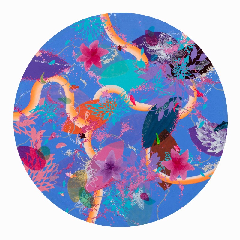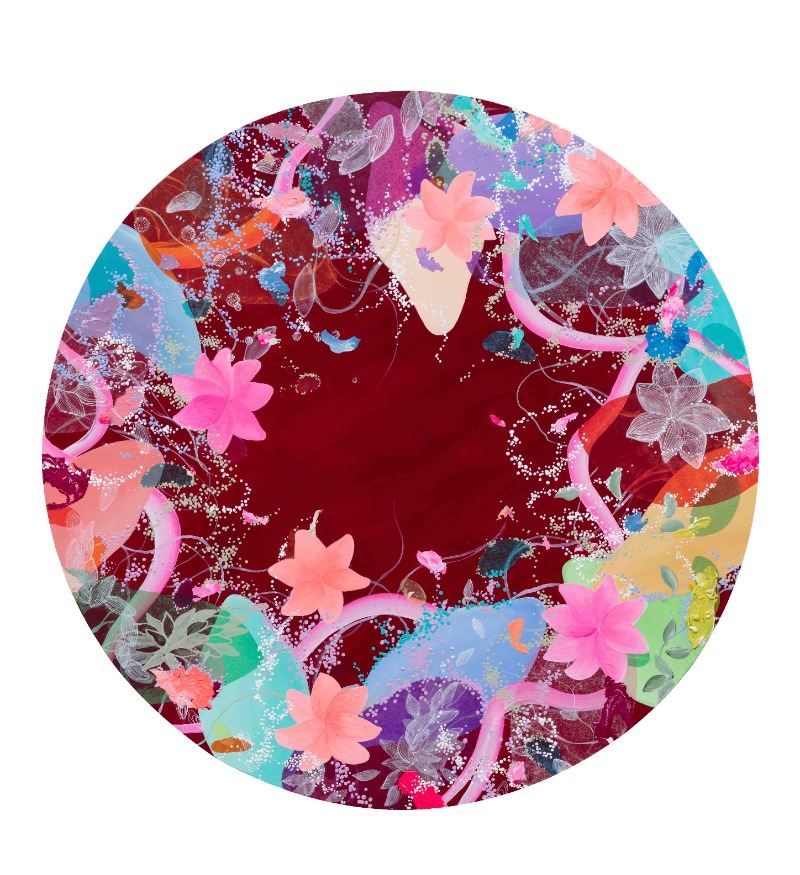 기다리는 시간은 메시지뿐만 아니라 작업의 형식에도 영향을 미쳤다. 이번 전시에 선보이는 작품에서는 이전보다 밀도가 높아진 것이 돋보인다. 특히 점의 집합이 눈에 띈다. 느리고 치밀한 과정이 엿보이는 점들은 각자의 평면에서 서로 다른 크기와 색, 점성과 농도로 저마다의 질서를 이룬다. 붓으로 찍어 올린 점이 있는가 하면, 잉크 펜촉으로 드로잉하듯 그려낸 더 세밀한 점이 있다. ‘한땀 한땀’이라는 수식어가 단번에 떠오르며, 점을 하나씩 새기는 동안 작가가 어떤 생각을 품었을지 유추해보게 한다. 점들이 모여 조직을 구성하는 형상은 결코 계획해서 연출할 수 없는, 유연하고 즉흥적인 모습이다. 점 외에도 그림 속 여타 형태 요소(form elements)들을 찬찬히 살펴보자. 미세한 개별 요소들이 조직적 구조로 뻗어 나가는 것은 굴곡이 심한 해안선, 나뭇가지, 번개 등의 기하학적 유기체 패턴을 연상시키기도 한다. ‘살아있음’을 직관하게 하는 이 서로 다른 요소들을 하나씩 따라가 보면 분열, 복제, 확장 등의 각각의 질서가 내재한 것을 가늠할 수 있다.