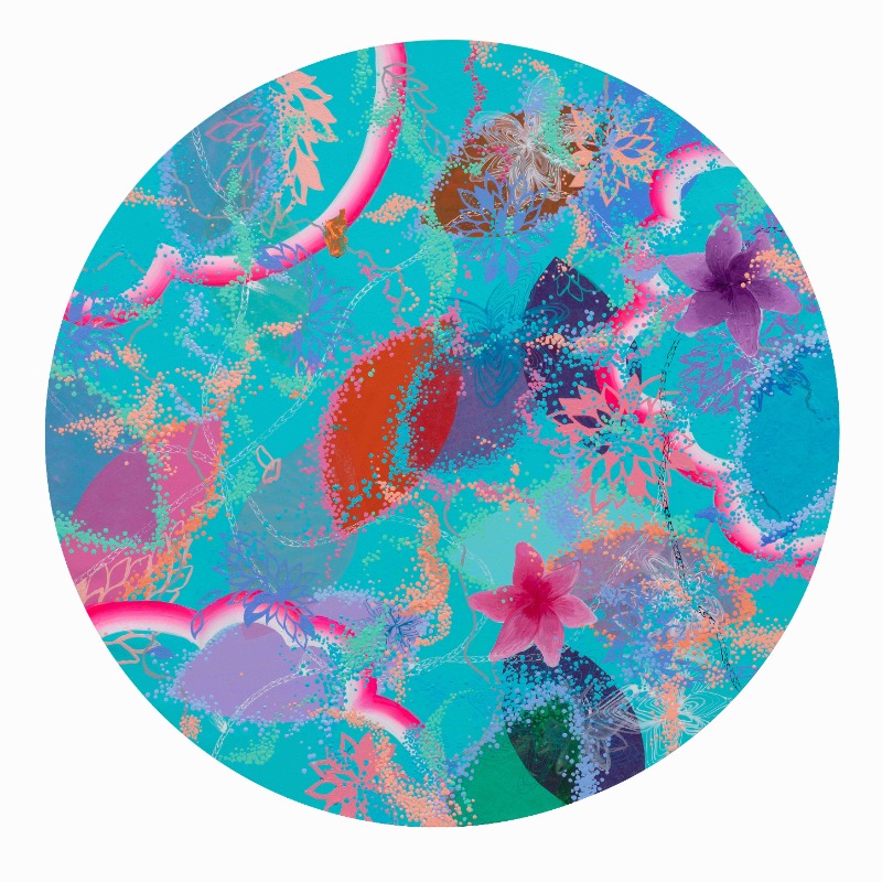 즉흥적이고도 조직적인 구성체들이 얽히고 흩어지며 리듬을 이루는 것은 평면에만 머무는 것이 아니라, 작가의 메시지를 공감각적으로 확장하게 하는 동력이 되었다. 설치작품 <무지개 너머 어딘가에(Over the Rainbow)>는 각 구성체를 더 심미적으로 파악하도록 이끈다. 마지막 3층의 전시장에는 회화 속 개별 요소를 아크릴판에 옮겨와 자르고, 이를 겹겹이 매달아 구현했다. 평면 위에서 칼로 새겨지고, 글리터와 만나 반짝이고, 에어 브러쉬의 분사로 몽환적인 분위기를 자아내던 각 요소를 3차원으로 옮겨와 빛과 만나게 하니 신비한 분위기가 더해졌다. “꿈을 현실로”¹  이끄는 판타지 세계를 상상할 법한 이 작품은 제이미 리가 건네는 안부의 말(Wish you all the best)과도 맞물린다.