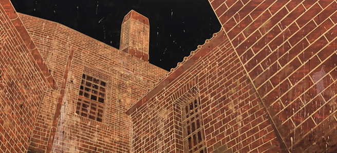 이어, 전시장 2층의 작품은 인간 소외가 어디에서부터 시작되었는지 그 배경을 암시적으로 보여준다. 미로와 같이 출구가 보이지 않는 계단, 온기 하나 없는 냉정한 공장의 철골 구조, 일거수일투족을 뒤쫓는 감시의 시스템 등 그의 그림 속에 나타나는 사회의 모습은 동시대적이면서도, 과거의 유물처럼 녹슬어 있고 또 미래의 풍경처럼 생경하고 삭막하다. 긍정도 부정도 하지 않으나 담담하게 사회 전반의 구조를 꿰뚫어 보는 시선으로, 저마다 다른 장면을 포착한 작업은 기계적 시스템과 인간의 도구화라는 하나의 주제를 향하여 균질한 톤으로 꿰어진다.