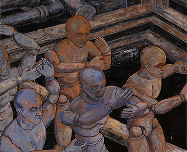 이번에 마주하게 될 그의 작품은 모두 최근 일, 이 년 사이 만든 신작이다. 전시장 입구에서부터 대작으로 관객을 덮칠 듯 맞이하는가 하면, 1층 벽면에는 한 폭이 무려 32m짜리 종이 위에 호탕하게 그림을 그렸다. 인간 존재의 실존 문제를 다루어 온 작가이건만, 그의 화면에 처음으로 인조인간도 등장하였다. 무엇이 그리도 좋은지 환희의 춤을 추는 매끈한 금속체의 로봇. 그 뒤편으로 기계보다 더 기계와 같이 획일화된 몸짓으로 인간들이 줄지어 있다. 거대한 파이프와 가스통 사이로, 빛 한 점 들지 않는 지하의 산업 현장에 유폐된 듯한 인간 군상의 모습은 마치 프리츠 랑(Fritz Lang)의 영화 <메트로폴리스(Metropolis; 1927)>의 한 장면을 연상하게 한다. 전시장의 1층에서 선보이는 작품들은 집단화된 인간의 통제된 신체와 인조인간의 자율성이 강한 대비를 이루며 ‘휴머니티란 무엇인가’에 대한 짙은 의문을 제기한다.