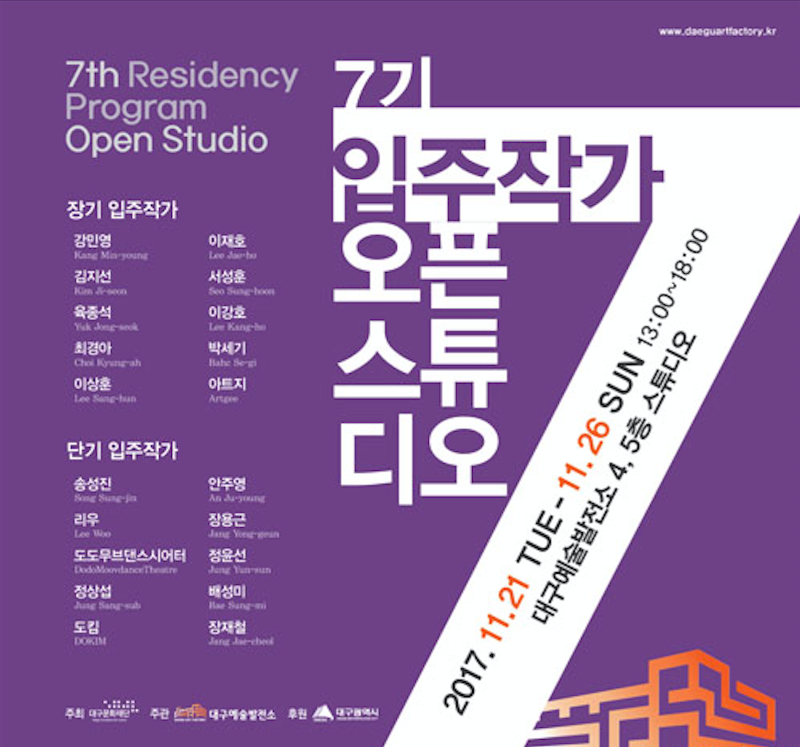 대구예술발전소 4층, 5층 스튜디오 참여작가 : 총 20팀(27명) 강민영, 이재호, 김지선, 서성훈, 육종석, 이강호, 최경아, 박세기, 이상훈, 아트지, 송성진, 안주영, 리우, 장용근, 도도무브댄스시어터, 정윤선, 정상섭, 배성미, 도킴, 장재철