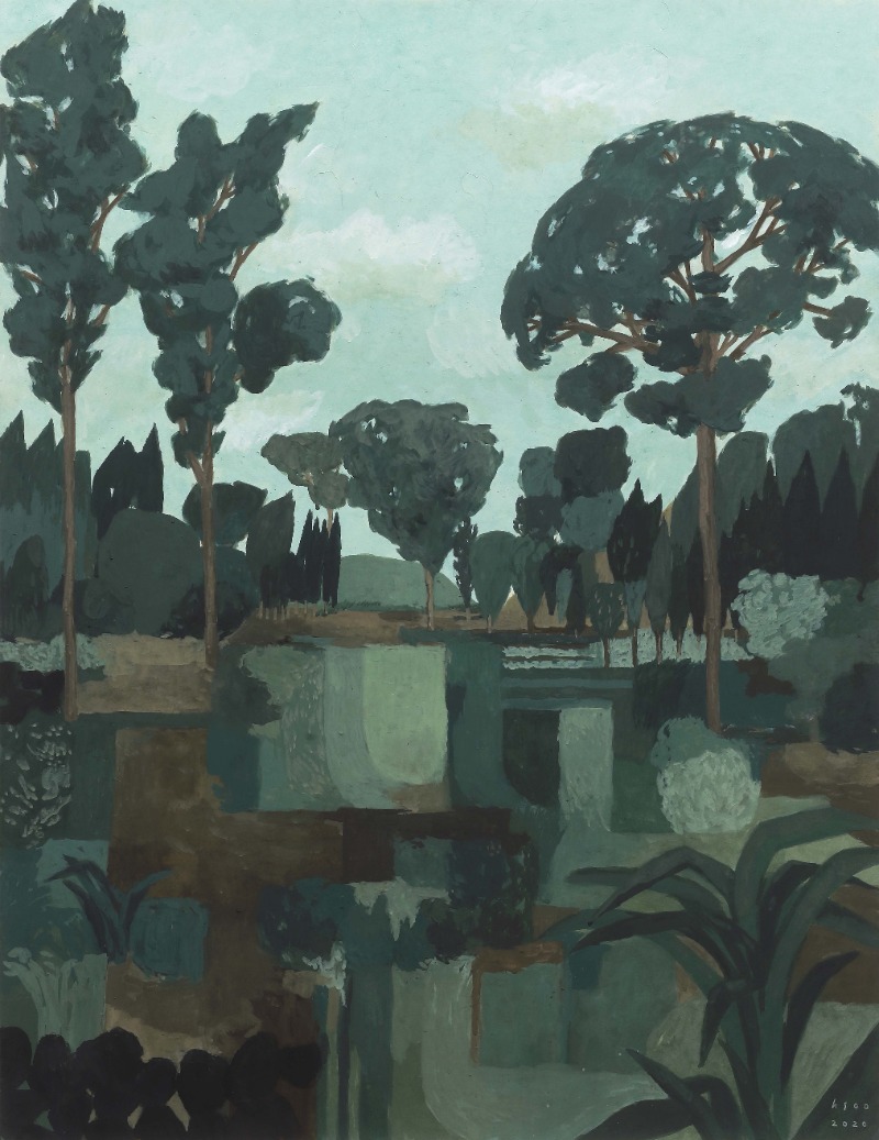 우리의 삶에 자연을 닮은 조경을 제공하는 것은 삶의 과정에서 생긴 상처를 치유하고 회복하는 장소를 갖는다는 의미다. 자연을 닮은 조경이 필요한 이유가 바로 여기에 있다. 조경은 건축물의 상징적인 의미를 가질 뿐 아니라 절묘하게 자연물과 인공소재의 조화를 이루며, 우리의 생활영역 안에 자연적 요소를 배치한 공간이다. 신작 〈유원(留園)〉(2021)는 재개발 사업을 통해 신축 아파트가 들어설 인공조경을 그린 것으로, 우리가 자연이라고 인지하는 것은 어쩌면 인위적으로 만들어지고 박제된 자연일지도 모른다는 의문에서 출발한 작업이다. 아파트에서 나서 자란 이른바 ‘아파트 키즈(kids)’들은 이러한 정형화된 조경을 보고 자라며 정서적 안정과 심리적 만족감을 얻을 것이다. 그렇다면 도시에 존재하는 자연의 참모습은 무엇일까. 실제적인 공간일 수도 있고 또는 의미만을 부여하는 허상일 수도 있겠다는 작가가 던지는 메시지다.