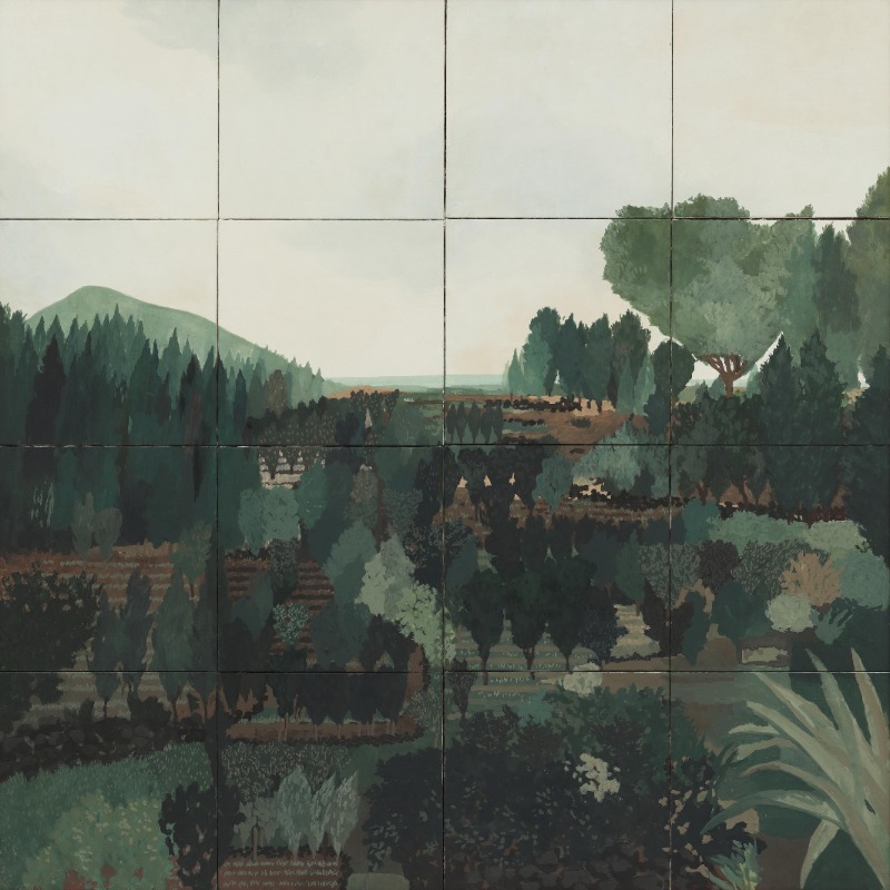 광활한 대지를 배경으로 등장하는 뾰족하고 짙은 초록빛의 나무들은 제주도에 서식하는 삼나무이다. 그의 기억 속에 어렴풋이 남아있는 삼나무 숲은 세모난 도형의 반복된 형태로 질서 정연하게 배열되어 울창하고 청량한 분위기를 이룬다. 대상을 바라보는 시선에 따른 고정된 장소에서 거리가 먼 풍경이나, 그가 마주친 〈시골길〉(2020)의 모습들은 이동 시점의 변화를 통해 드론(drone)을 띄워 촬영한 듯한 로드뷰 형식으로 주제를 부각한다. 또한 저채도의 초록빛은 기억 속 어딘가에서 스며든 잔상들과 결합되어 제주다움의 녹음을 표현한다. 이번 전시에서 김현수는 30여 개의 화면으로 제주의 토종식물을 그린 신작 〈찰나의 영원〉(2021)을 선보인다. 전시장 벽면을 채울 수 있는 캔버스를 퍼즐처럼 분리하여 조합한 형식은 조각난 기억을 맞춰나가듯 어릴 적 ‘나’와 교감하는 방식이라고 할 수 있겠다.