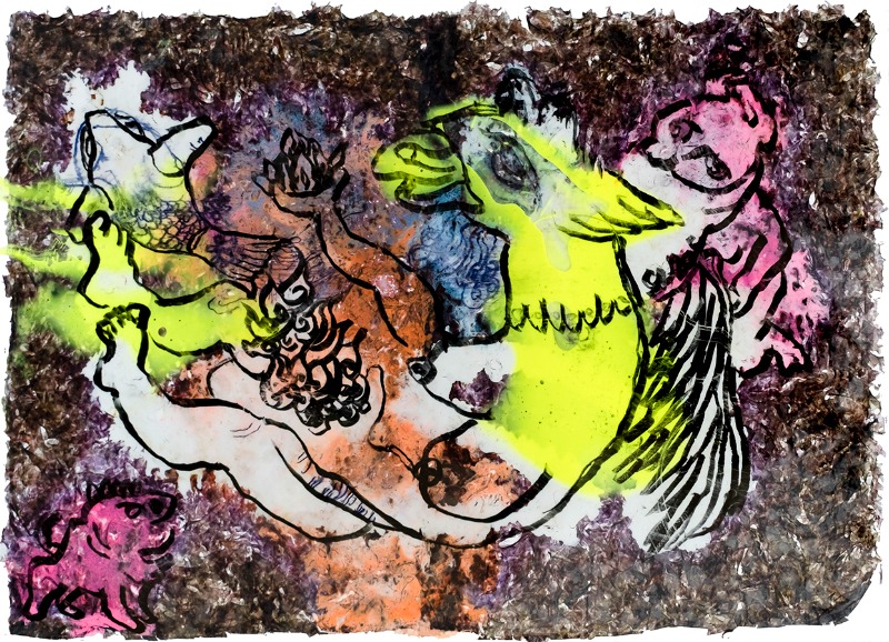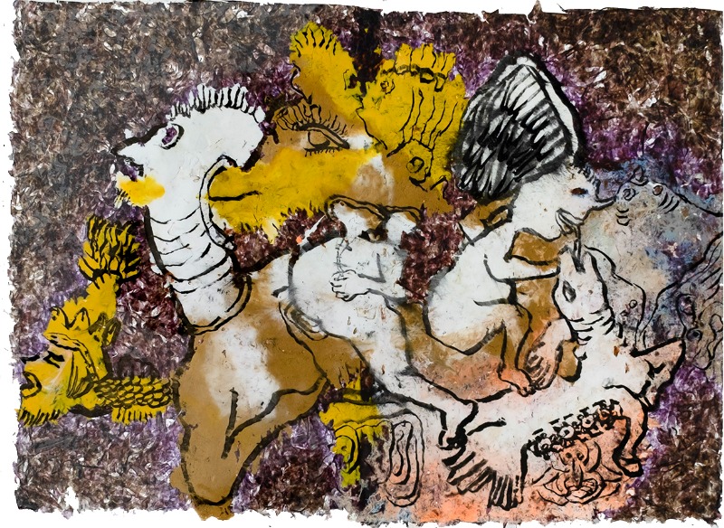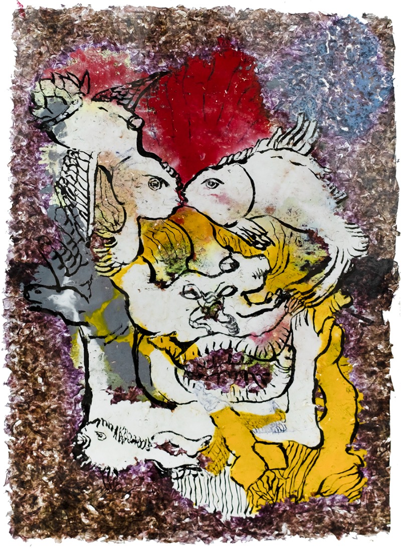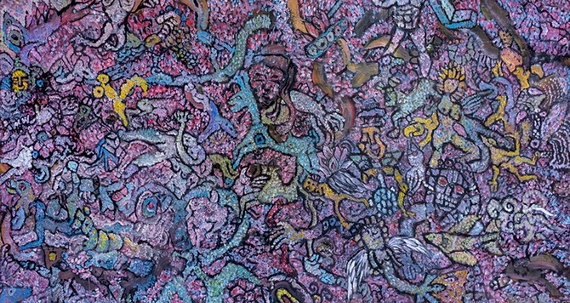 반면, 작가 윤돈휘가 제시하는 지옥상, 혹은 업행(業行, karma)에 등장하는 존재들에서 우수나 비감이 언뜻 드러날지 모르지만 고통이나 괴로움은 찾아보기 어렵다. 오히려 장난스럽거나 행복감에 젖은 표정도 찾을 수 있다. 정성스레 찍어나간 점묘는 강박적이다 하기에는 지향성이 느슨하고, 분방한 드로잉 밑에 들어앉은 물감은 채색되었다기보다 엎은 자국처럼 보인다. ‘암각화코드’ 연작은 비교적 견고한 벽돌 구조가 눈에 띄지만 말 그대로 기호더미일 뿐, 엄숙함은 찾기 어렵다. 더욱이 ‘종교작가’를 자칭하며 다양한 매체와 설치를 통해 이 분야에 대해 신화구조, 양자물리학, 진화론 등으로 자기 활동을 해설해온 그의 이력을 감안하면, 계몽적 기능이 있으리라 추측하기는 어렵다.