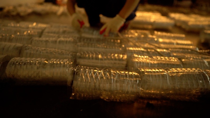 신작 <매트, 보트, 카펫>은 1,000여개의 페트병을 이어 붙여 만든 설치 작업이다. 한 사람이 간신히 몸을 뉠 수 있는 매트는 뗏목의 일부로 긴 줄로 연결되어 있다. 가족, 마을이나 나라 같은 자신의 공동체를 떠나야만 했던 누군가의 삶이 가진 최소한의 면적을 매트로, 가족이 함께 탈 수 있는 작은 보트로, 그리고 원하는 이를 실어 하늘을 날 수 있는 마법의 카펫으로 작업은 역할한다. 1988년 작가가 체류했던 님므에서 발생한 엄청난 홍수에서 이 작업은 시작했다. 구호품으로 조달된 마실 생수병, 그 빈 플라스틱 병들이 도심에 수없이 굴러다녔던 상황을 제 예술 안에 담았다. 지금 서유럽에서는 또다시 유례없는 홍수를 겪어 내고 있다는 자연 재해 소식이 들려온다. 소비 세계의 패턴을 끊지 못한 우리에게는 반복될 수밖에 없는 자연의 반응을 겪고 있는 것이다.
