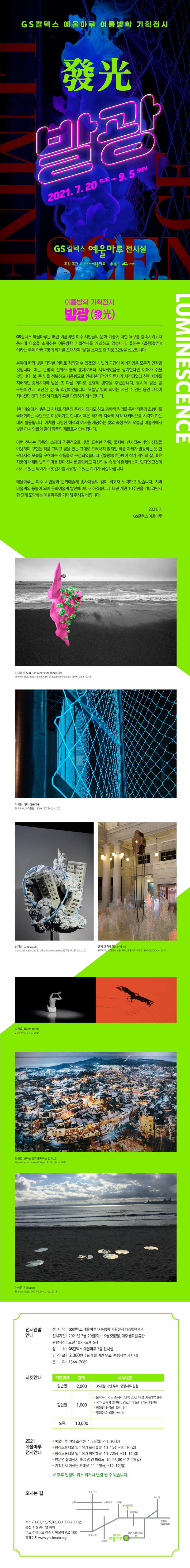 • 			GS칼텍스 예울마루는 매년 여름이면 여수 시민들의 문화·예술에 대한 욕구를 충족시키고자 동시대 미술을 소개하는 여름방학 기획전시를 개최하고 있습니다. 올해는 <발광(發光)> 이라는 주제 아래 7명의 작가를 초대하여 '빛'을 소재로 한 작품 32점을 선보입니다.