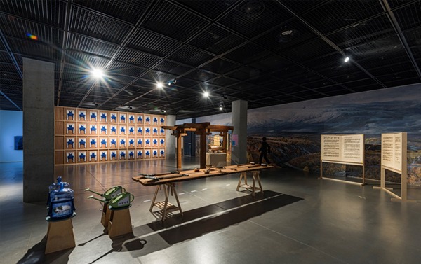 2021(출처=국립아시아문화전당) 분단의 테이블(따듯한 밥상)위에 남북정상회담 만찬 당시 사용한 냉면그릇, 종지, 나무망치, 삽 등 1쌍의 기념사물들 400 x 100 x 80 cm