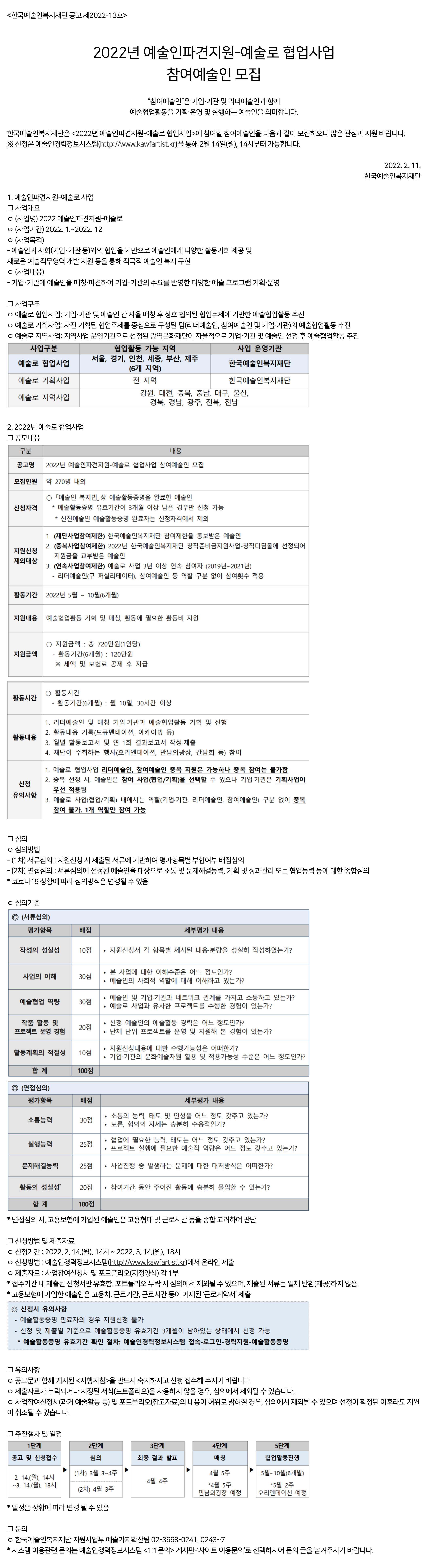 문의| 한국예술인복지재단 지원사업부 예술가치확산팀 02-3668-0241, 0243~7