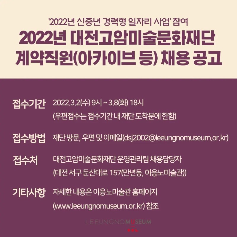 고용노동부와 대전광역시가 지원하고 대전고암미술문화재단에서 수행하는 「2022년 신중년 경력형 일자리 사업」 참여 계약직원(아카이브 등) 모집을 공고합니다.