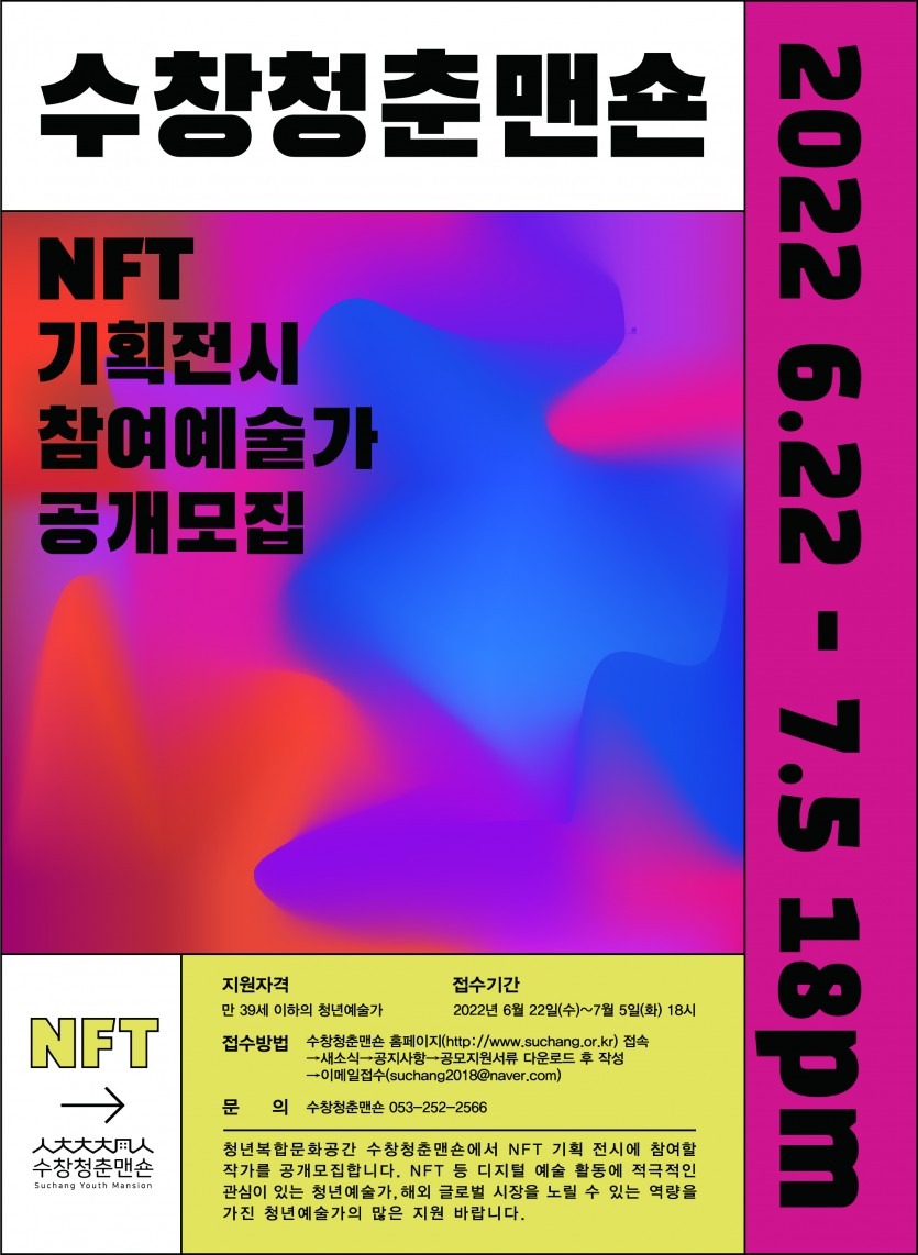 청년복합문화공간인 수창청춘맨숀에서 NFT기획전시에 참여할 작가를 공개 모집합니다.
