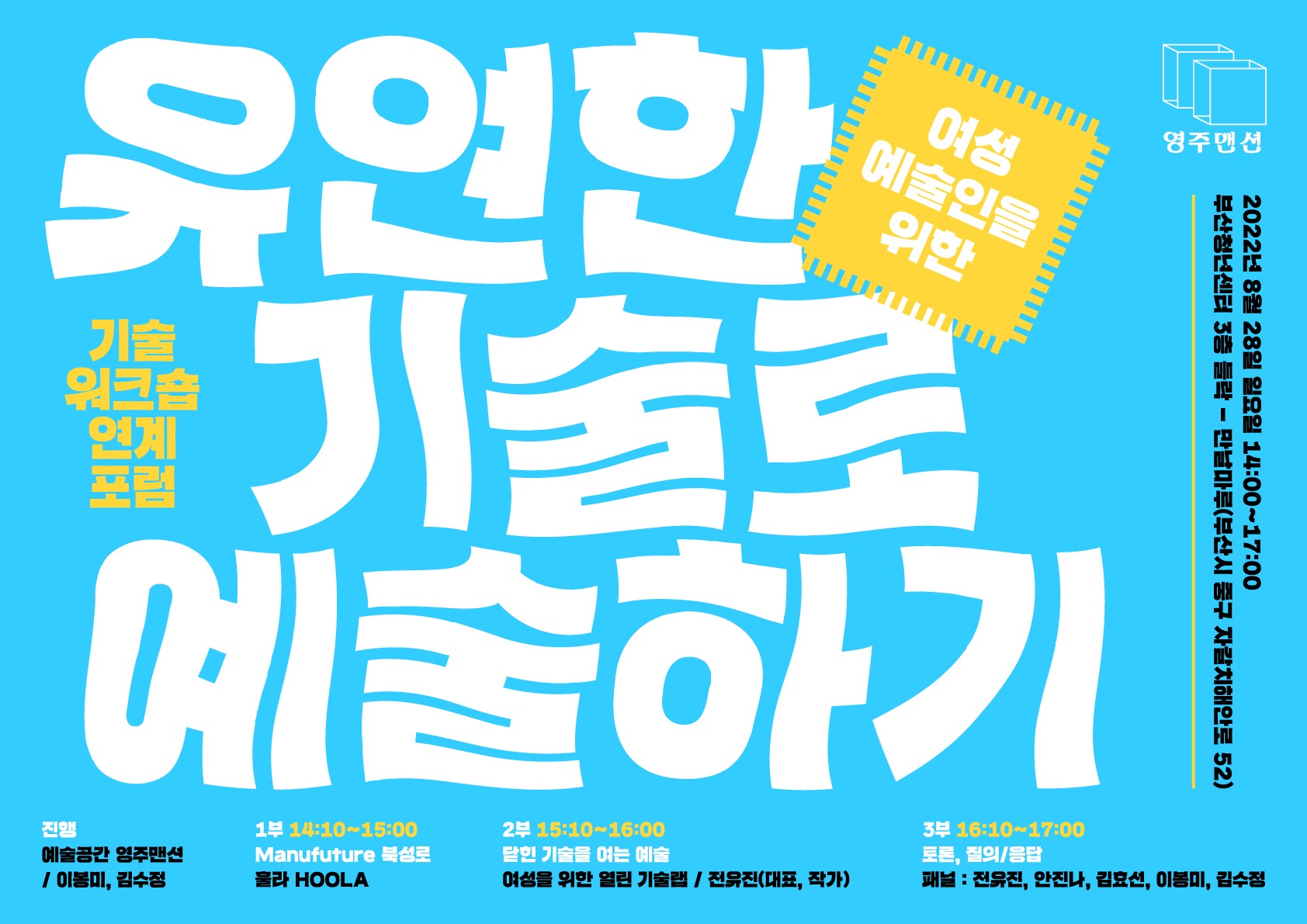 영주맨션에서 여성예술가를 위한 기술워크숍의 연계로 8월 28일 포럼을 개최합니다. 작년 공구워크숍에서 출발해 기술워크숍을 개최한 올해 다른 곳에서 활동하는 분을 모셔 함께 이야기를 듣고 해보는 자리를 마련하고자 합니다. <유연한 기술로 예술하기>에서 기술은 다양한 의미를 나타내며 예술을 만나 주변영역으로 확장되는 유연한 예술을 의미합니다. 가볍고 유연하게 풀어갈 이번 포럼에 많은 참석 부탁드립니다.