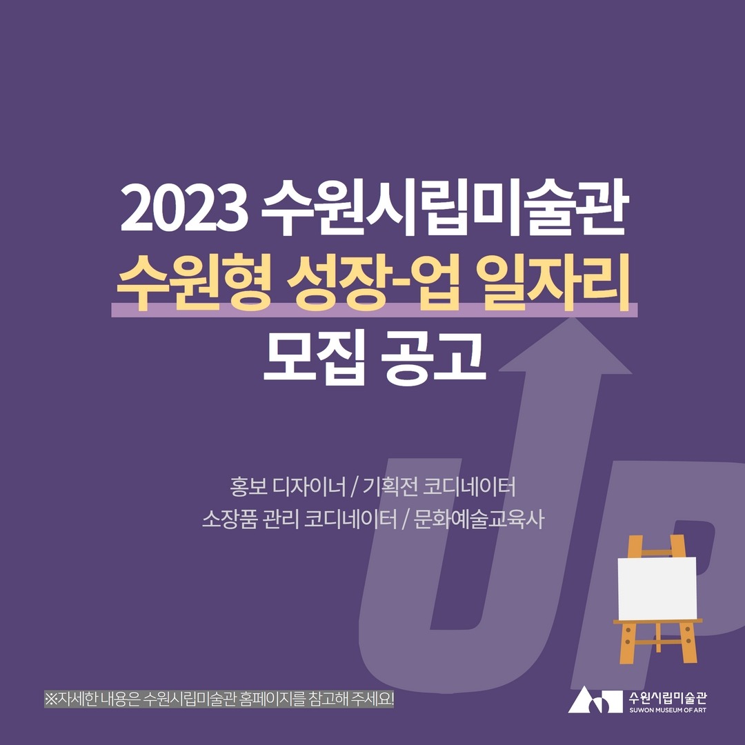 수원시립미술관은 2023년을 함께할 수원형 성장-업 일자리 참여자를 모집합니다. 총 4개 분야를 모집하고 있으니, 관심 있으신 분들의 많은 지원 바랍니다.