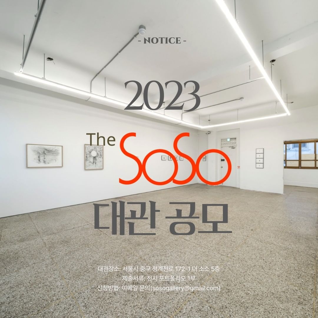 모집분야: 평면, 입체, 영상, 설치, 뉴미디어 등 시각예술 전 분야 대관장소: 서울시 중구 청계천로 172-1 더 소소 5층 대관기간 1차: 2023.06.16(금) - 07.14(금) 2차: 2023.10.13(금) - 11.10(금) 3차: 2023.11.24(금) - 12.22(금) 신청방법: 이메일 문의 (sosogallery@gmail.com) 제출서류: 전시 포트폴리오(전시기획서, 작가 CV, 작품 이미지 등) 1부 신청기간: ~2023.02.07(화)까지 *결과는 2월 12일(일)까지 개별 연락 우대사항: 문화예술 분야 기관 및 단체의 예술지원 선정 전시 (ex. 문화재단) 문의: sosogallery@gmail.com
