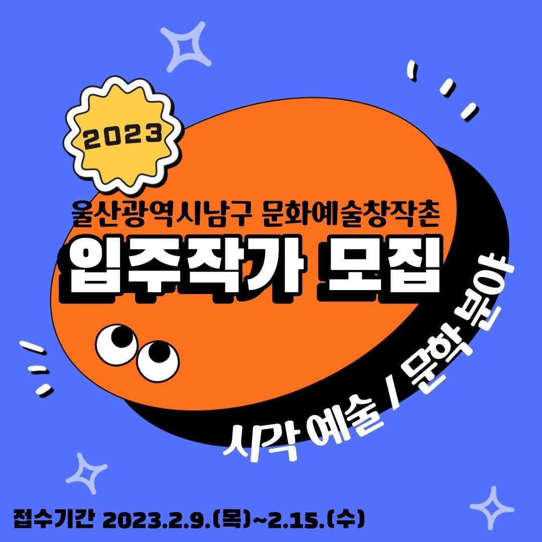울산광역시남구 문화예술창작촌(장생포 아트스테이 & 창작스튜디오 장생포고래로131 & 신화예술인촌)은 울산 남구 내에 조성된 창작 공간으로 예술가들에게 안정적인 창작 환경 및 전시 기회를 제공하고, 시민과 예술가들의 자연스러운 소통 창구를 마련하고자 합니다. 울산광역시 남구를 바탕으로 활발한 창작 활동을 펼쳐갈 창의적인 예술가를 공개 모집하오니 많은 지원 바랍니다.