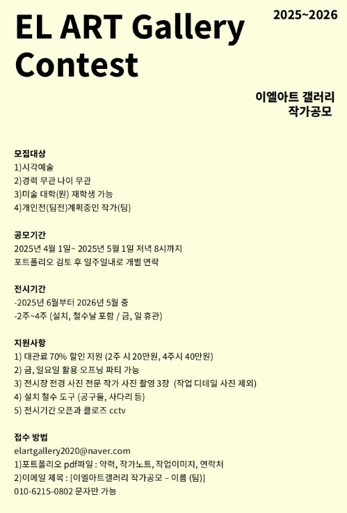 ▪️공모기간 2025년 4월 2일 ~ 2025년 5월 1일 저녁 8시까지 포트폴리오 검토 후 일주일 내로 개별 연락 * 선착순 전시 일정 확정됩니다.