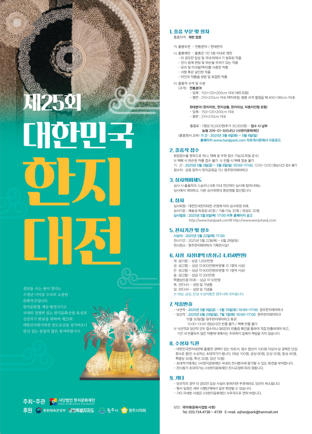 천년을 사는 종이 한지는 수천년 이어갈 우리의 소중한 문화자산입니다. 한지문화를 계승·발전시키고 국내외 경쟁력 있는 한지문화산업 육성과 신진작가 발굴을 위하여 제25회 대한민국한지대전 공모요강을 공지하오니 관심 있는 분들의 많은 참여바랍니다.