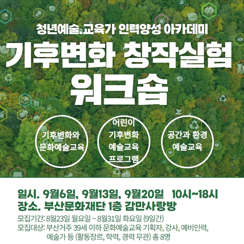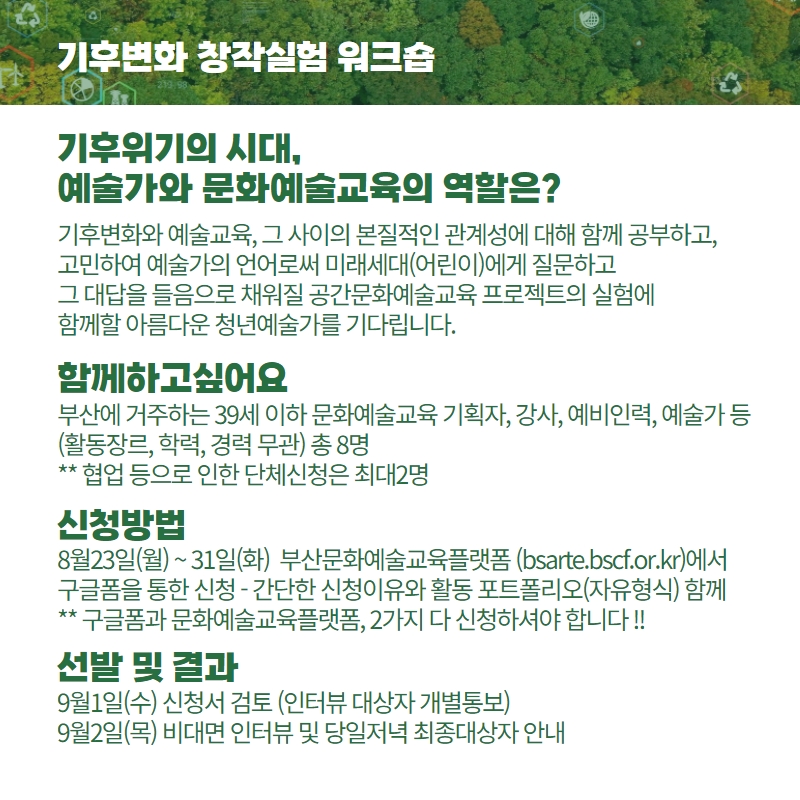 - 모집대상: 부산거주 39세 이하 문화예술교육 기획자, 강사, 예비인력, 예술가 등(활동장르, 학력, 경력 무관) 총 8명