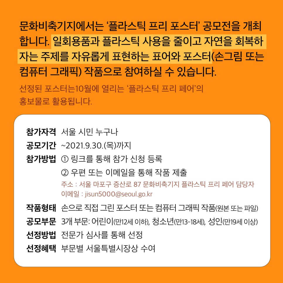 문화비축기지에서는 ‘플라스틱 프리 포스터’ 공모전을 개최합니다. 일회용품과 플라스틱 사용을 줄이고 자연을 회복하자는 주제를 자유롭게 표현하는 표어와 포스터(손그림 또는 컴퓨터 그래픽) 작품으로 참여하실 수 있습니다.