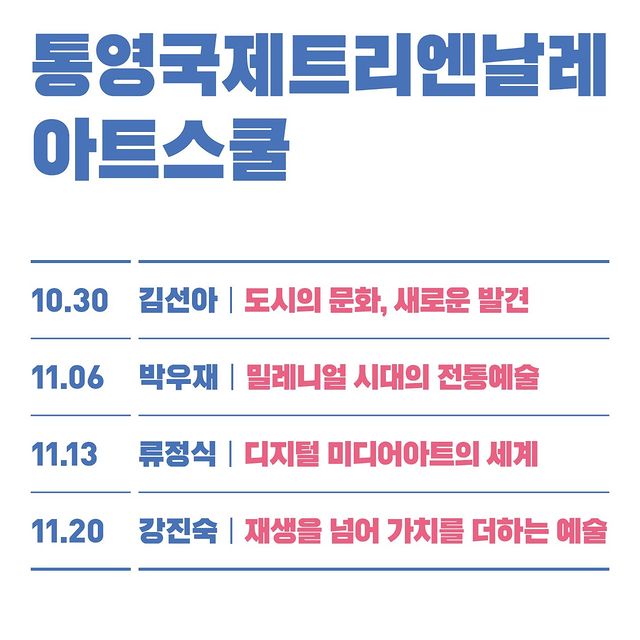 • 10.30 1강 도시의 문화, 새로운 발견 | 강연자 : 김선아 • 11.06 2강 밀레니얼 시대의 전통예술 | 강연자 : 박우재 • 11.13 3강 디지털 미디어아트의 세계 | 강연자: 류정식 • 11.20 4강 재생을 넘어 가치를 더하는 예술 | 강연자 : 강진숙